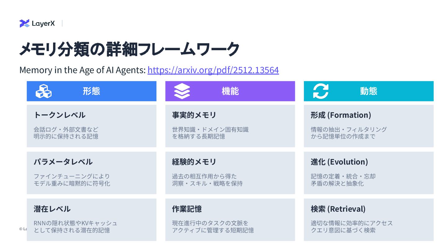 事実的メモリ 世界知識‧ドメイン固有知識 を格納する⻑期記憶 形成 (Formation) 情報の抽出‧フィルタリング から記憶単位の作成まで パラメータレベル ファインチューニングにより モデル重みに暗黙的に符号化 経験的メモリ 過去の相互作⽤から得た 洞察‧スキル‧戦略を保持 進化 (Evolution) 記憶の定着‧統合‧忘却 ⽭盾の解決と抽象化 潜在レベル RNNの隠れ状態やKVキャッシュ として保持される潜在的記憶 作業記憶 現在進⾏中のタスクの⽂脈を アクティブに管理する短期記憶 検索 (Retrieval) 適切な情報に効率的にアクセス クエリ意図に基づく検索 メモリ分類の詳細フレームワーク Memory in the Age of AI Agents: https://arxiv.org/pdf/2512.13564