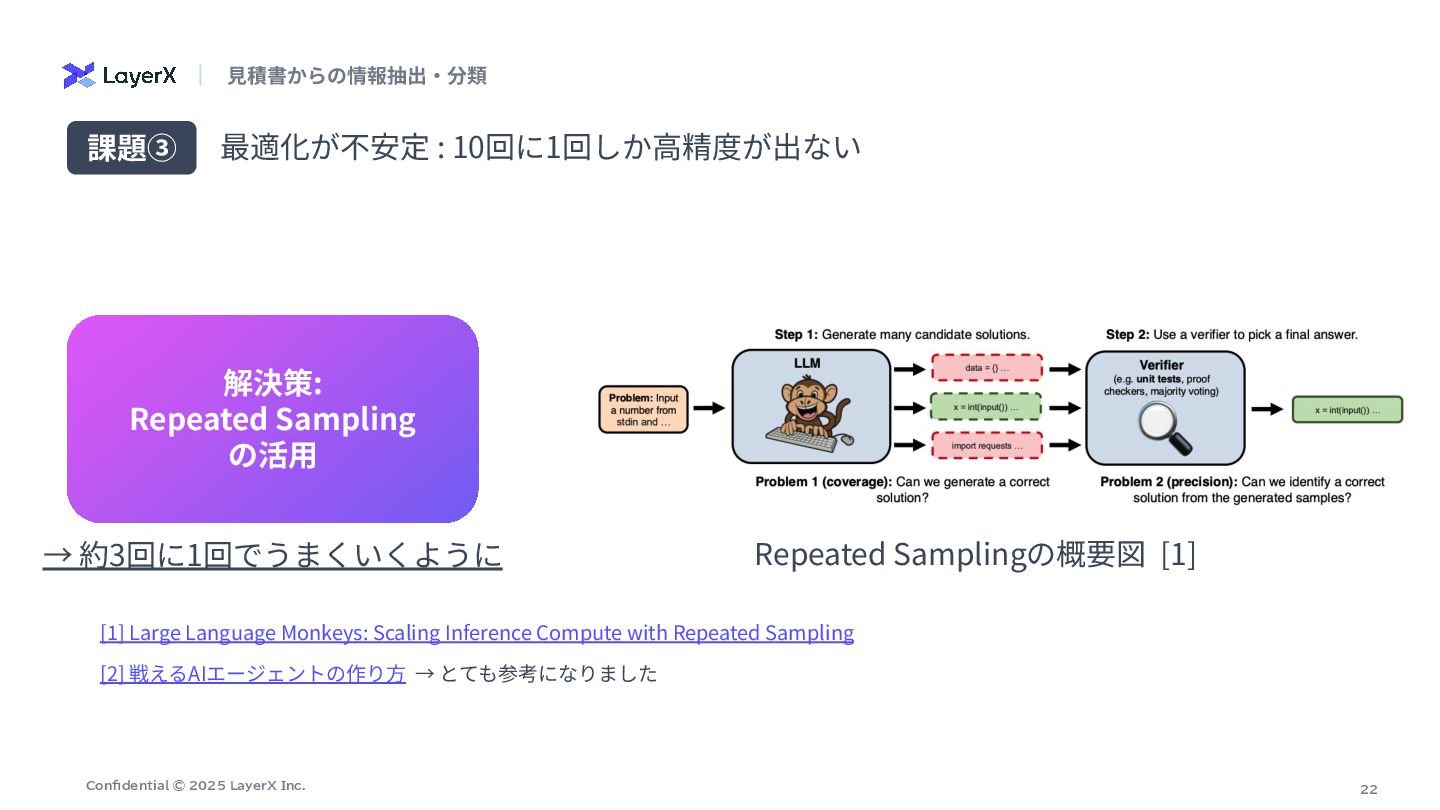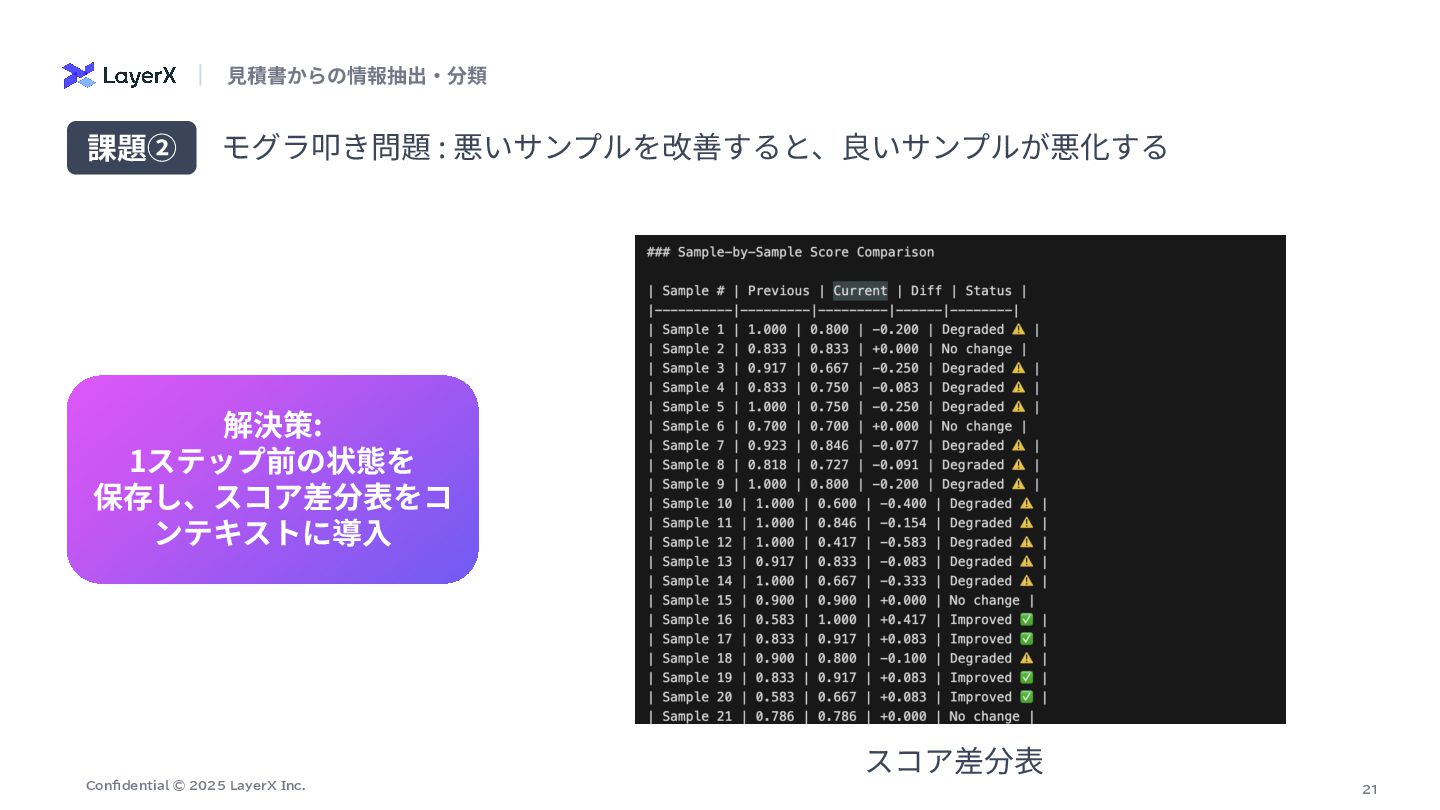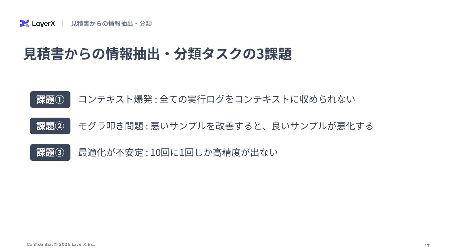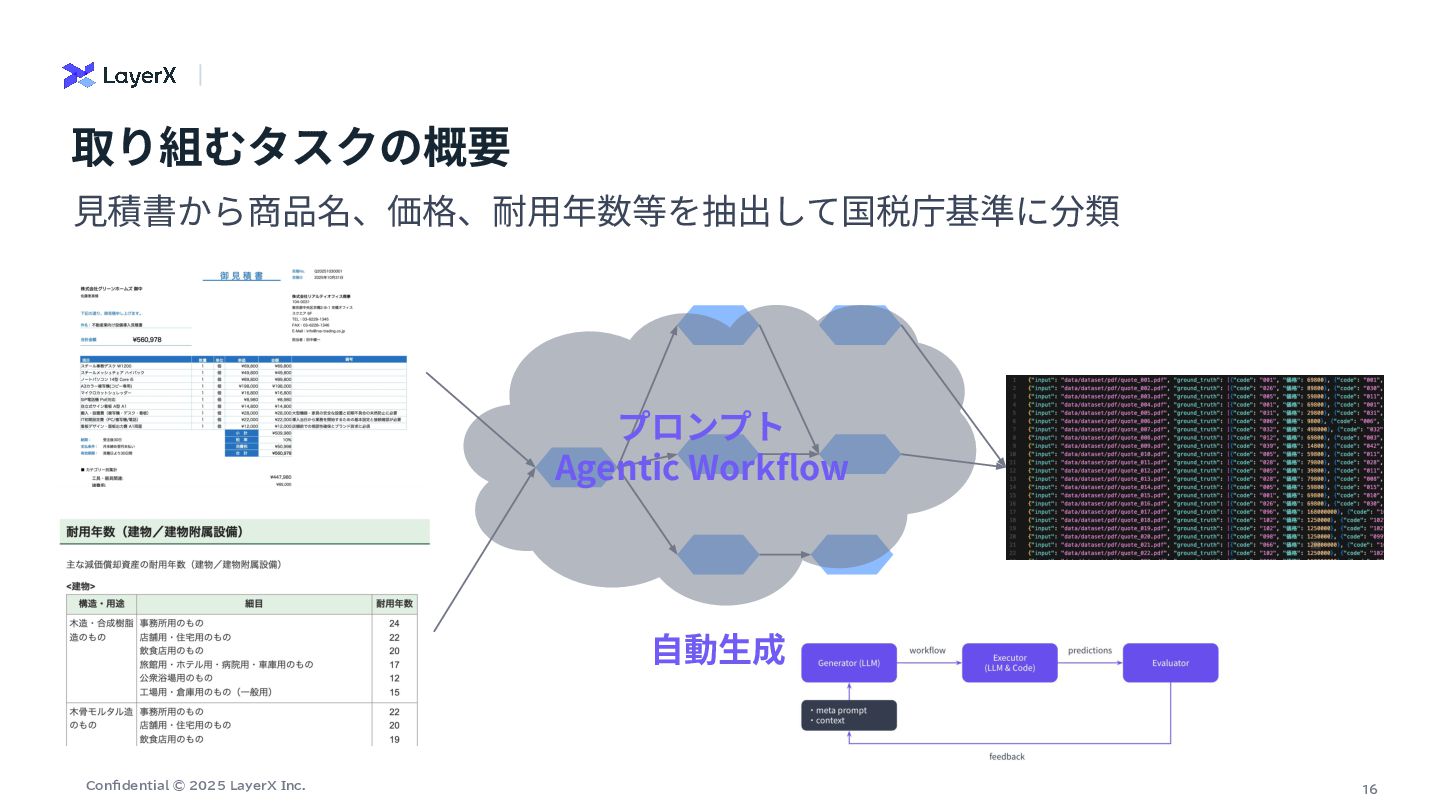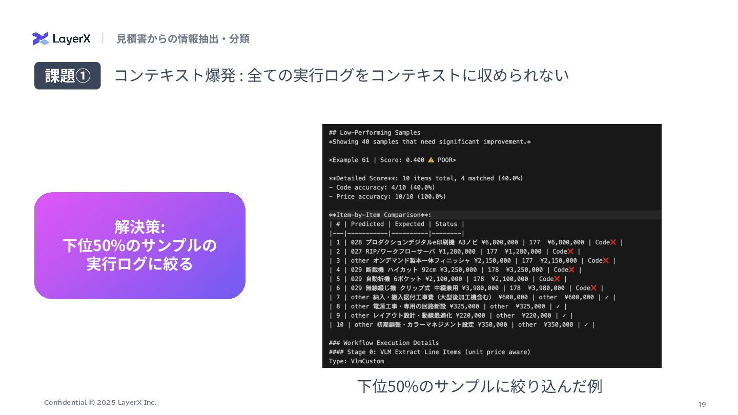 # 抽出ポリシー(価格の選択) - ⾏内に数量(数量、Qty、台、式、セット、m、個 等)が明⽰され、明らかに数量>1の場合は「単価(unit_price)」を価格として採⽤する。 - 数量が1または数量が明確でない場合は「⾏合計(line_total)」を価格として採⽤する。 - 単価‧合計のどちらとも特定できない場合のみ price_source="unknown" とし、推測や計算はしない。 # 厳守ルール: - 計算や単位変換を⾏わない(表⽰されている整数値をそのまま採⽤)。 - OCR誤読補正をしない(⾒えた⽂字‧数字をそのまま使う)。 - 数字が複数並ぶ場合は、列⾒出しと⽔平⽅向の対応から「単価」「合計/⾦額/⼩計」欄を判断する。右端の⾦額列が合計欄であることが多いが、数量>1のときは合計ではなく単価欄を 優先する。 - ⾒出し/カテゴリ合計(例: 「その他設備」「諸費⽤」「⾞両関連」「⼯具‧器具関連」「⼩計」「合計」「消費税」等)は品⽬ではなく、row_roleを適切に付与 (heading/category_summary/subtotal/tax/grand_total/shipping_total)し、単価‧合計の選択はしない。 - 値引きは符号を保持。通貨記号やカンマは除去し整数化。 row_role と price_source: - row_role: one of ["item","service","work","discount","heading","category_summary","subtotal","tax","grand_total","shipping_total"] - price_source: one of ["unit_price","line_total","subtotal","category_total","grand_total","tax","unknown"] # 出⼒形式(JSONオブジェクト、説明⽂禁⽌) { "items": [ { "商品名": "<⾏テキスト>", "価格": <整数>, "row_role": "<上記のいずれか>", "price_source": "<上記のいずれか>", "数量": <整数またはnull>, "unit_price": <整数または null>, "line_total": <整数またはnull> } , ... ] } # 補⾜ - 「数量」「unit_price」「line_total」は判読できた範囲で記録(無ければnull)。 - サービス‧⼯事(据付/搬⼊/試運転/教育/申請 等)は row_role を "service" または "work" とする。 - 表が乱れている場合でも、その⾏テキストに最も紐づく列の値を選ぶ。 ⽣成されたプロンプト : VLM(商品名と価格の抽出)ノード