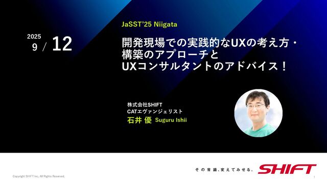 Inc, All Rights Reserved. 1 JaSST’25 Niigata 12 9 開発現場での実践的なUXの考え方・ 構築のアプローチと UXコンサルタントのアドバイス! 石井 優 株式会社SHIFT CATエヴァンジェリスト Suguru Ishii
