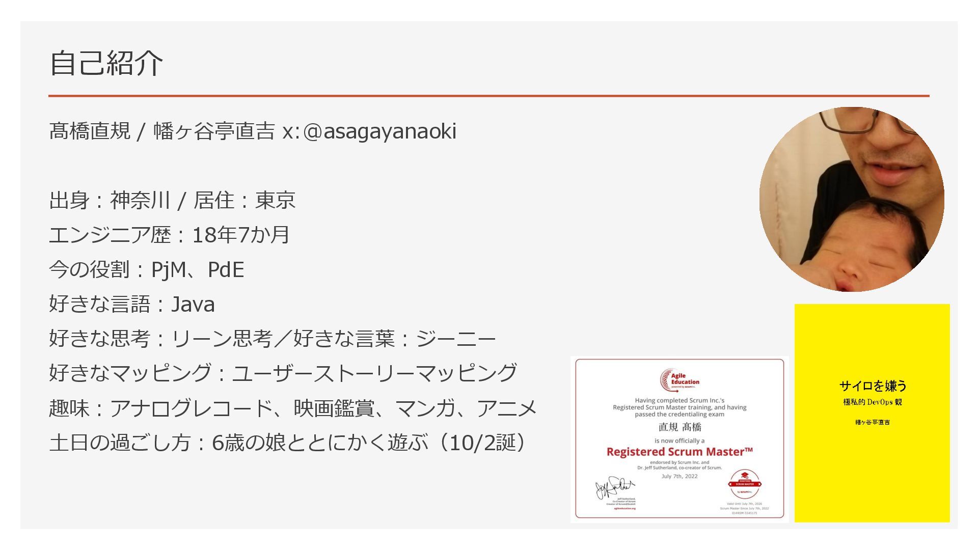 好きな言語:Java 好きな思考:リーン思考/好きな言葉:ジーニー 好きなマッピング:ユーザーストーリーマッピング 趣味:アナログレコード、映画鑑賞、マンガ、アニメ 土日の過ごし方:6歳の娘ととにかく遊ぶ(10/2誕)