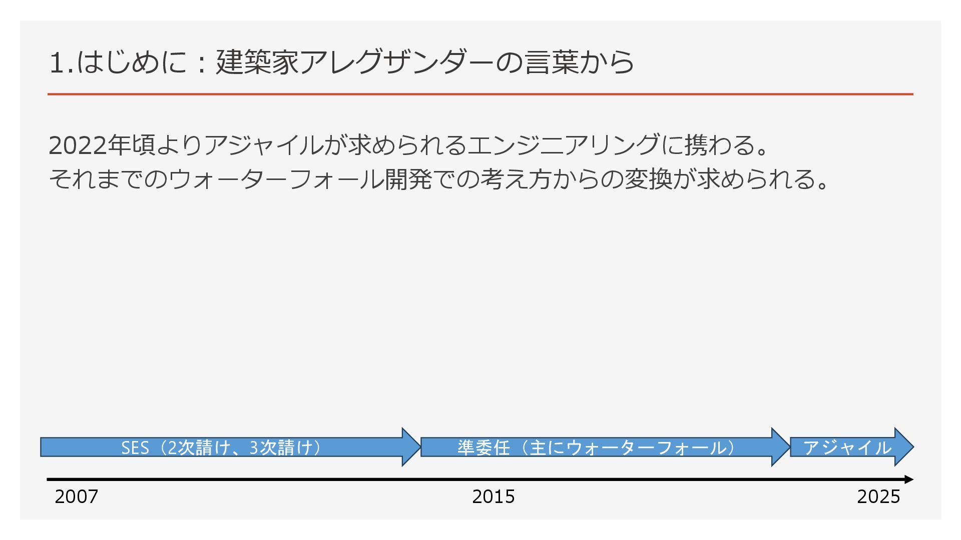 1.はじめに:建築家アレグザンダーの言葉から 2022年頃よりアジャイルが求められるエンジニアリングに携わる。 それまでのウォーターフォール開発での考え方からの変換が求められる。 2007 2025 2015 SES(2次請け、3次請け) 準委任(主にウォーターフォール) アジャイル