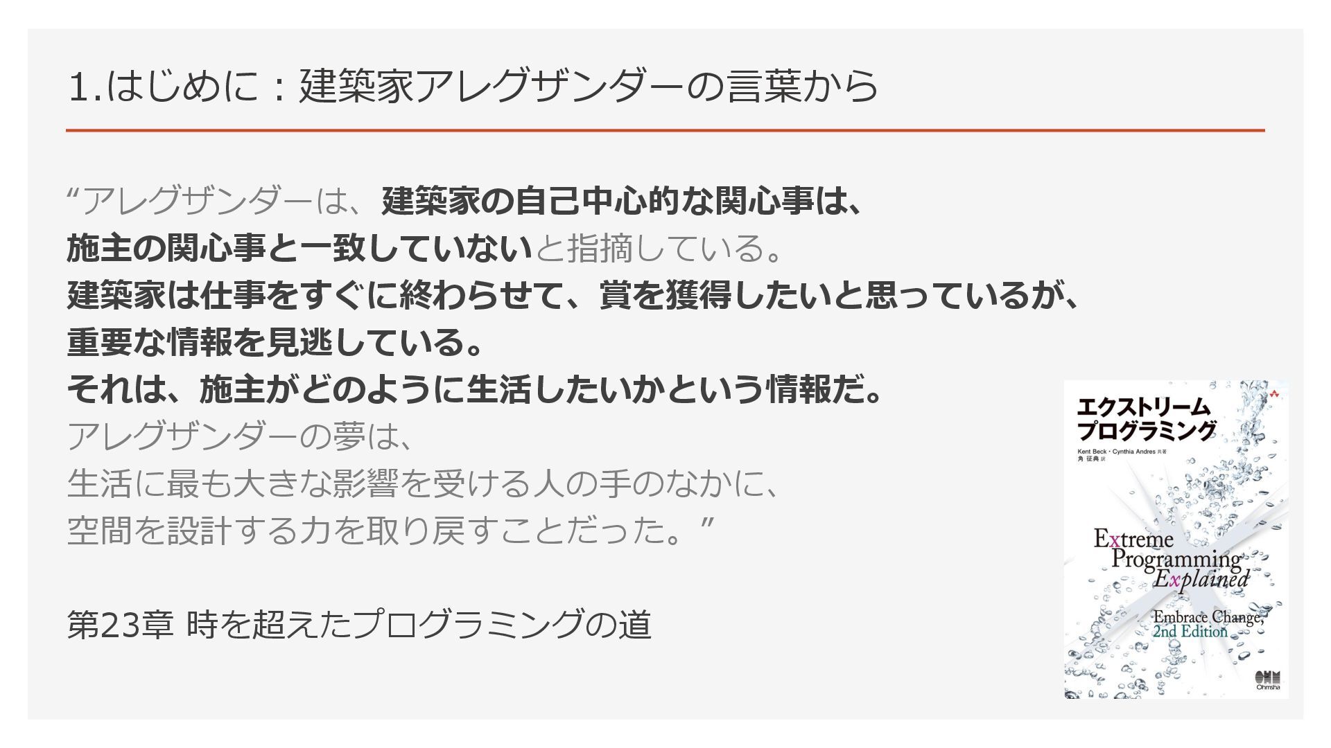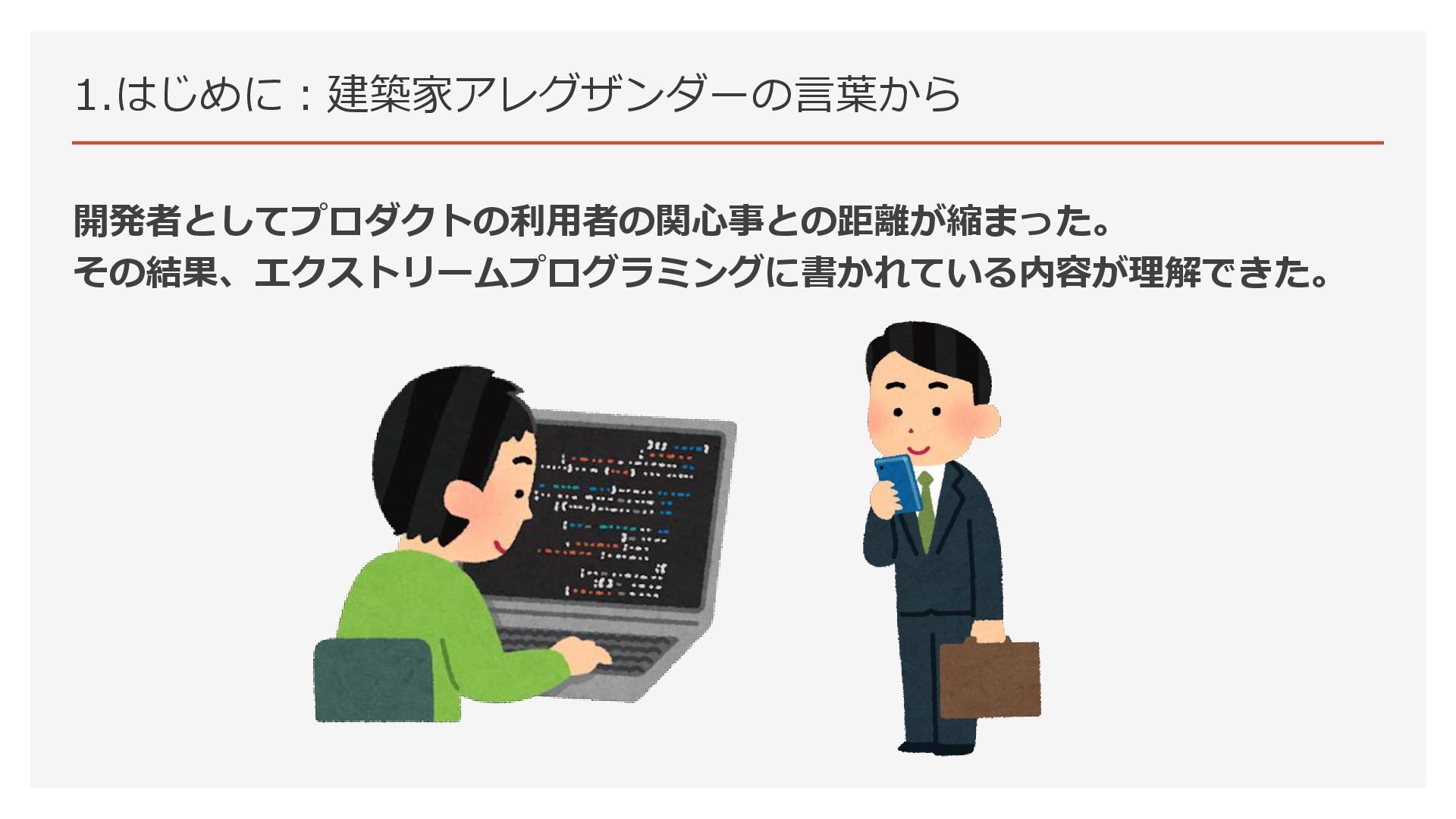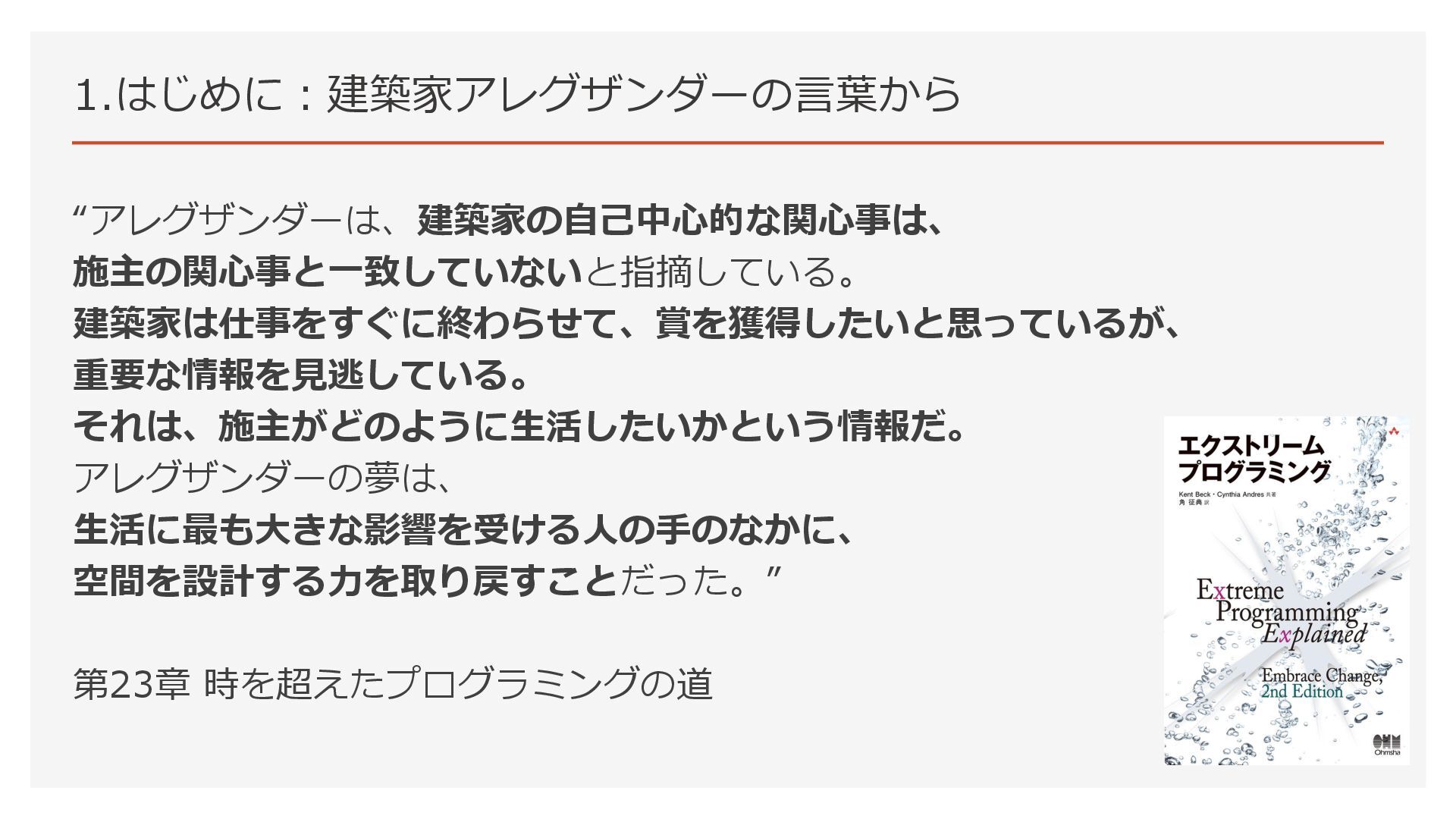 1.はじめに:建築家アレグザンダーの言葉から 開発者としてプロダクトの利用者の関心事との距離が縮まった。 その結果、エクストリームプログラミングに書かれている内容が理解できた。