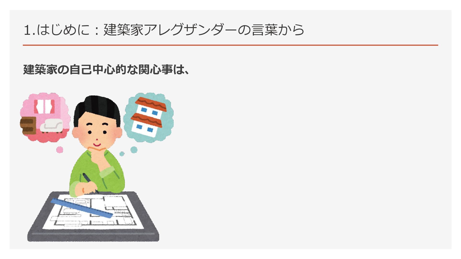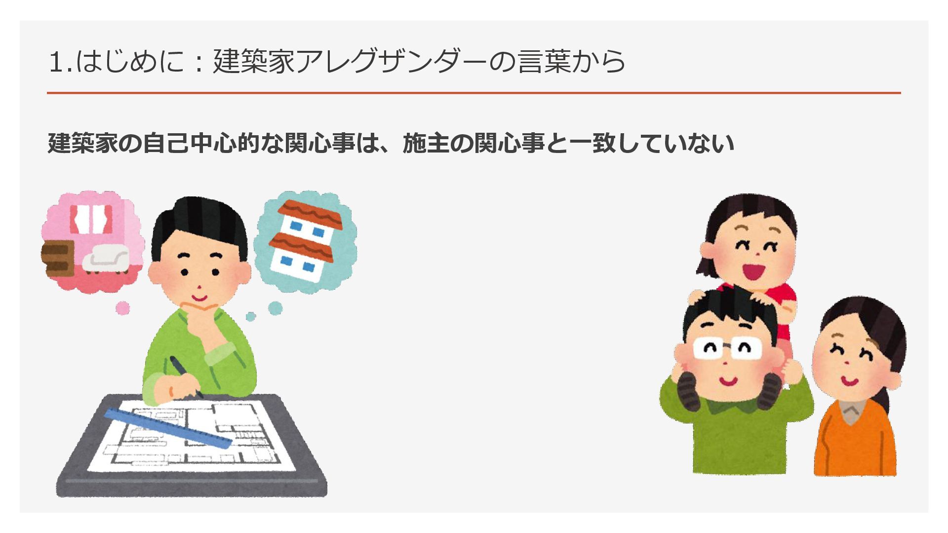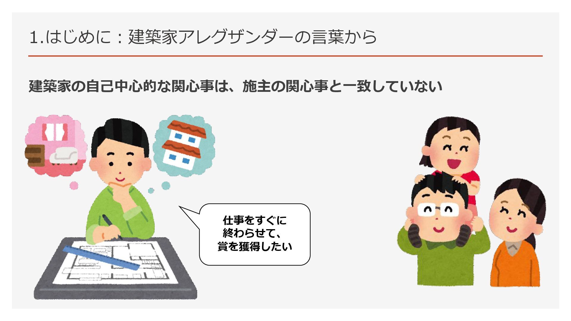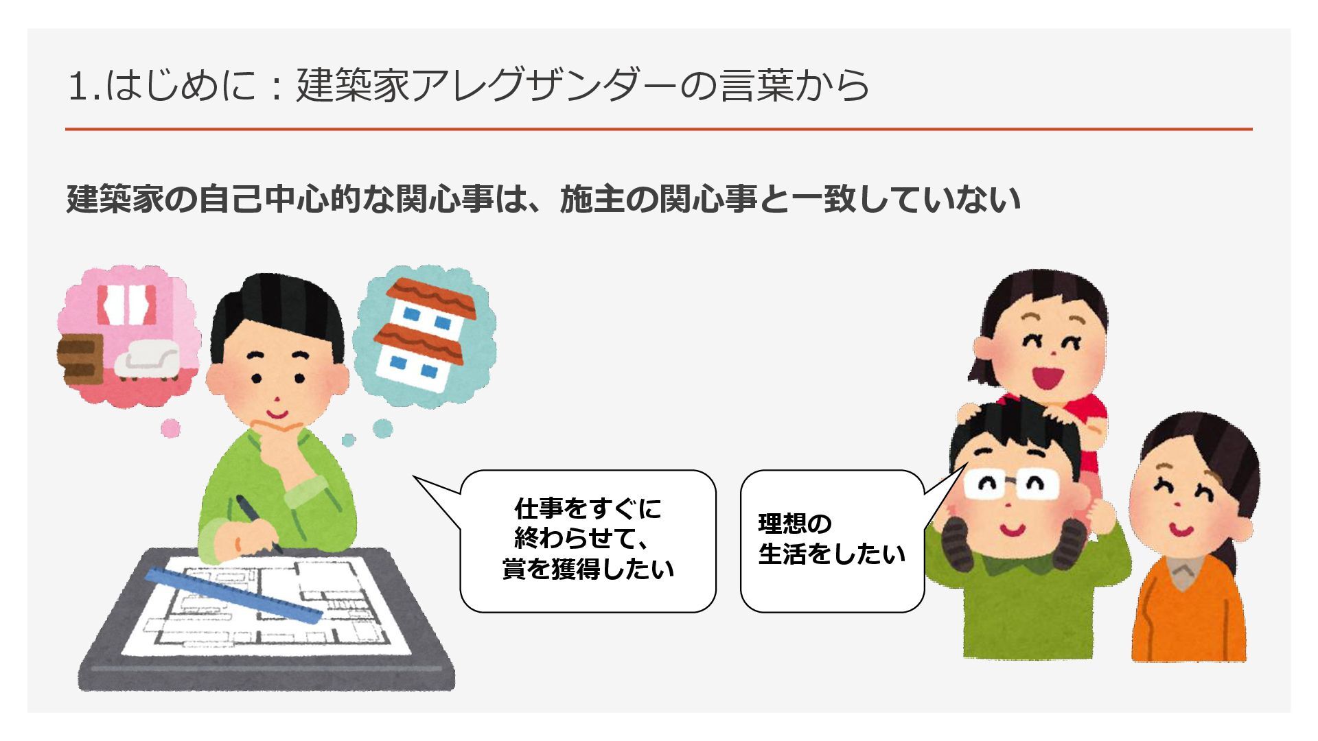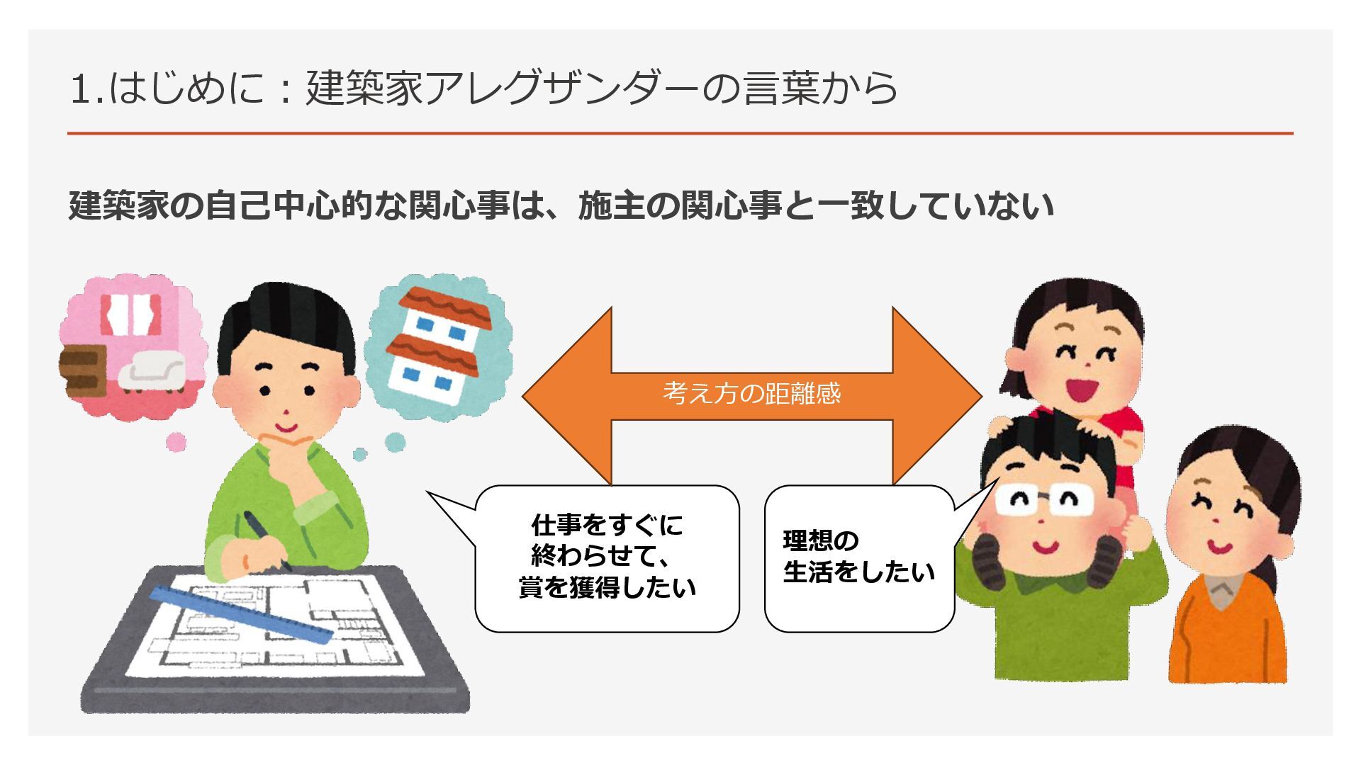 1.はじめに:建築家アレグザンダーの言葉から 建築家の自己中心的な関心事は、施主の関心事と一致していない 仕事をすぐに 終わらせて、 賞を獲得したい 考え方の距離感 理想の 生活をしたい