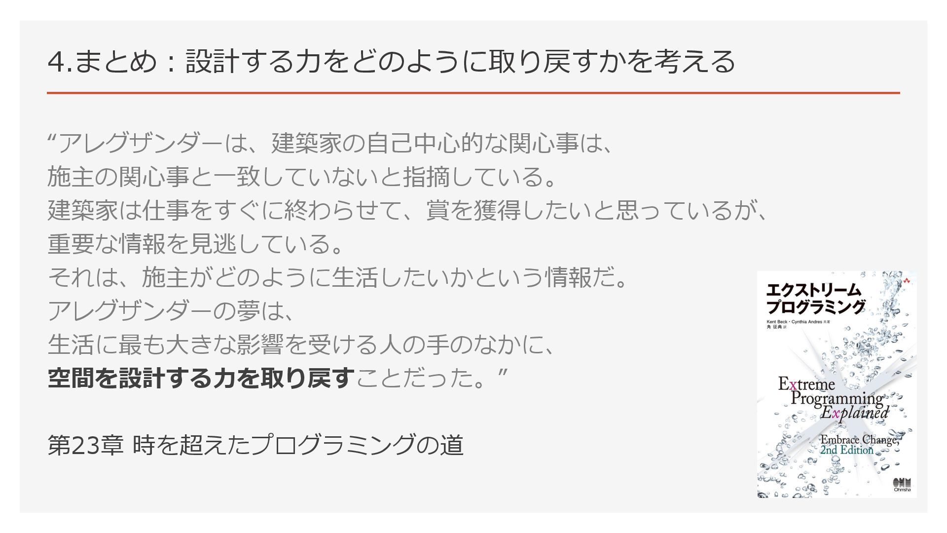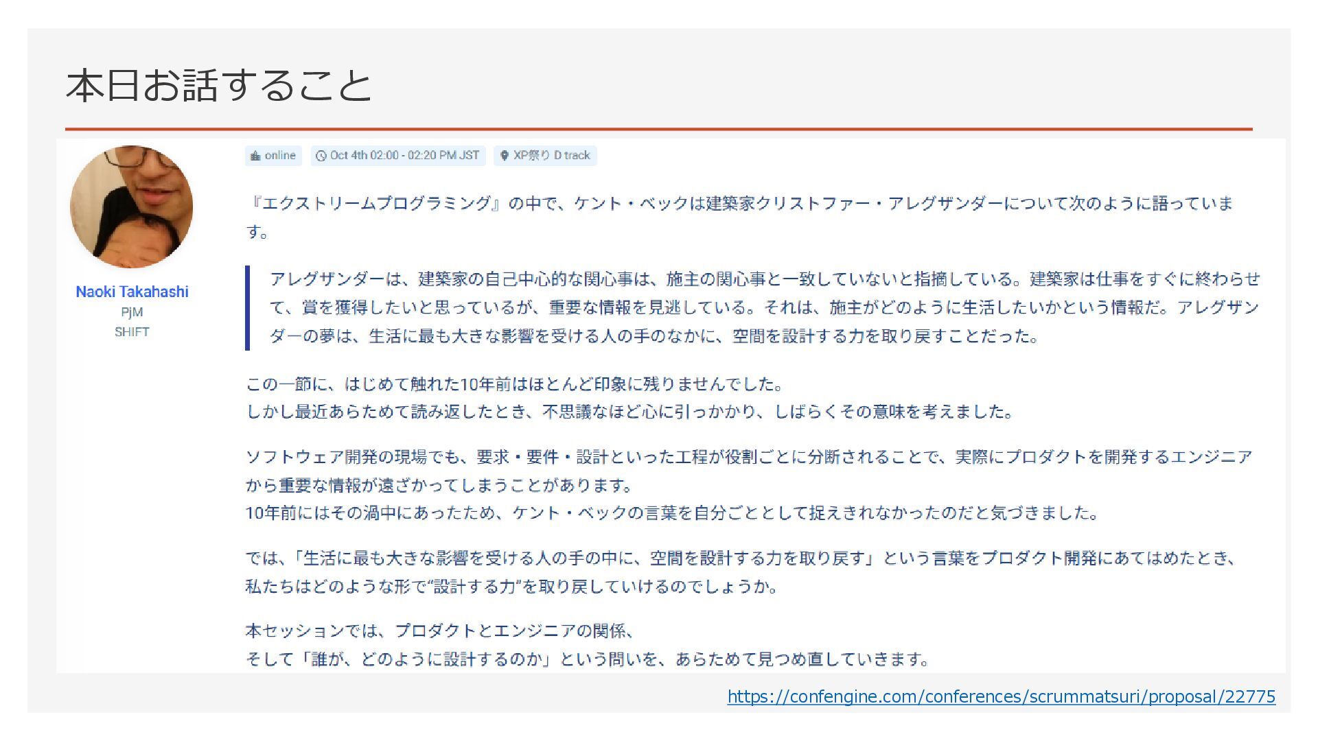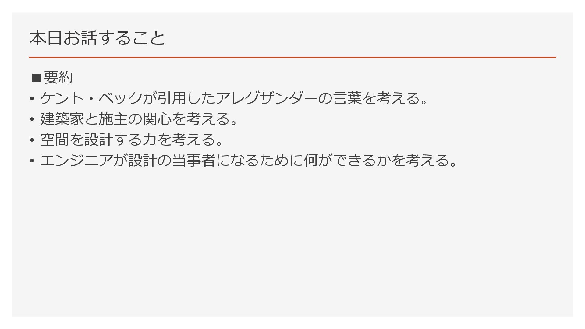 本日お話すること ▪要約 • ケント・ベックが引用したアレグザンダーの言葉を考える。 • 建築家と施主の関心を考える。 • 空間を設計する力を考える。 • エンジニアが設計の当事者になるために何ができるかを考える。