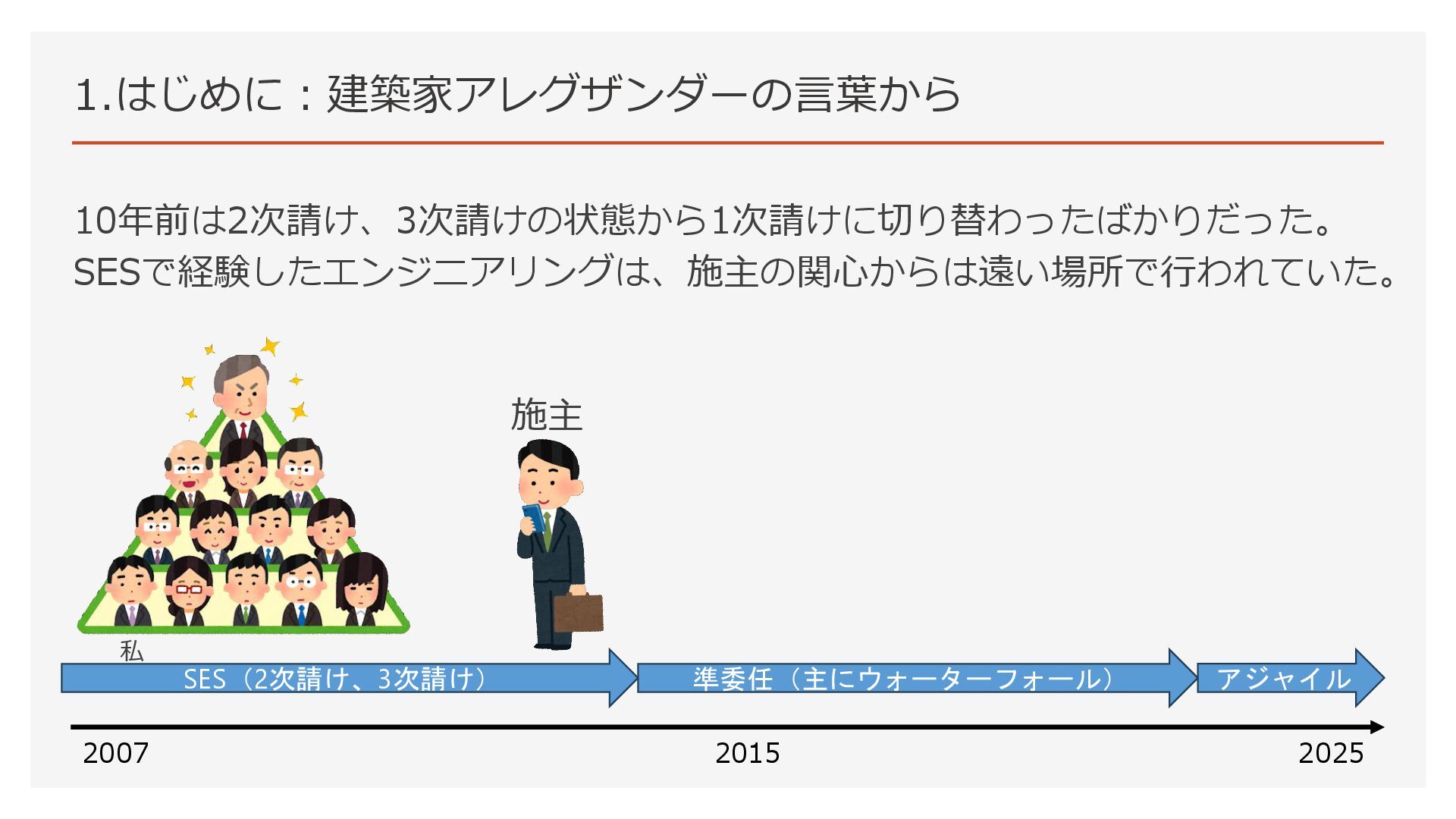 1.はじめに:建築家アレグザンダーの言葉から 10年前は2次請け、3次請けの状態から1次請けに切り替わったばかりだった。 SESで経験したエンジニアリングは、施主の関心からは遠い場所で行われていた。 2007 2025 2015 施主 SES(2次請け、3次請け) 準委任(主にウォーターフォール) アジャイル