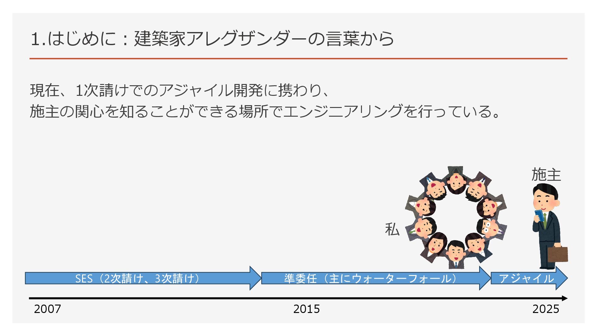 1.はじめに:建築家アレグザンダーの言葉から 現在、1次請けでのアジャイル開発に携わり、 施主の関心を知ることができる場所でエンジニアリングを行っている。 2007 2025 2015 私 SES(2次請け、3次請け) 準委任(主にウォーターフォール) アジャイル