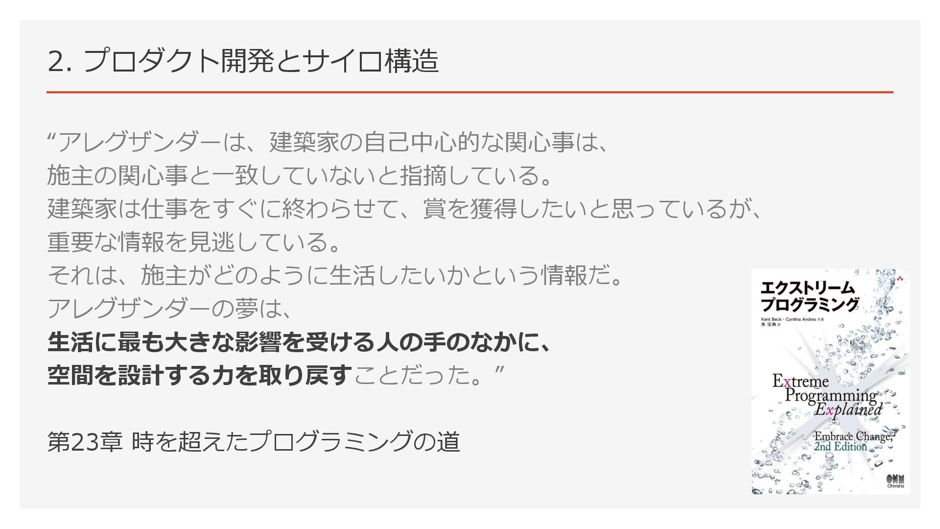 2. プロダクト開発とサイロ構造 “アレグザンダーは、建築家の自己中心的な関心事は、 施主の関心事と一致していないと指摘している。 建築家は仕事をすぐに終わらせて、賞を獲得したいと思っているが、 重要な情報を見逃している。 それは、施主がどのように生活したいかという情報だ。 アレグザンダーの夢は、 生活に最も大きな影響を受ける人の手のなかに、 空間を設計する力を取り戻すことだった。”