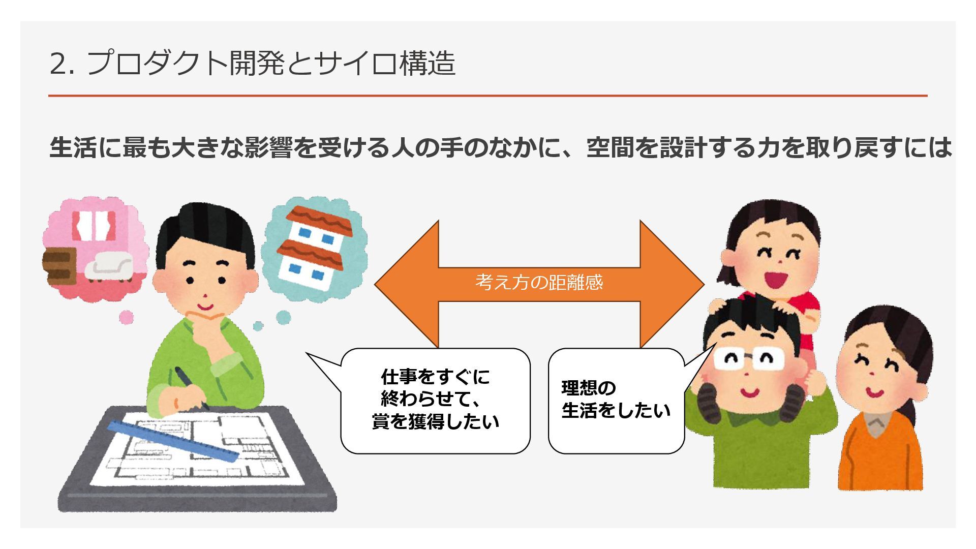 2. プロダクト開発とサイロ構造 生活に最も大きな影響を受ける人の手のなかに、空間を設計する力を取り戻すには 考え方の距離感 仕事をすぐに 終わらせて、 賞を獲得したい 理想の 生活をしたい