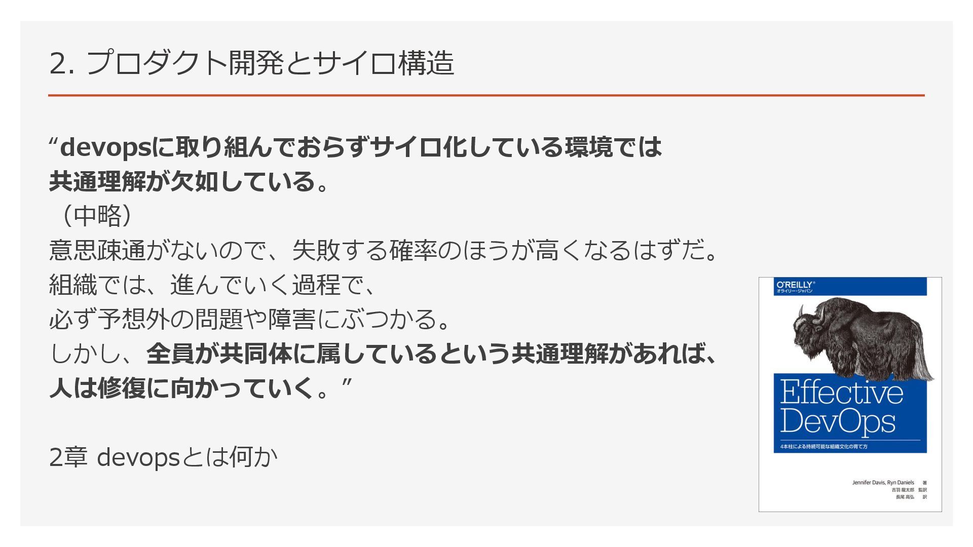2. プロダクト開発とサイロ構造 “devopsに取り組んでおらずサイロ化している環境では 共通理解が欠如している。 (中略) 意思疎通がないので、失敗する確率のほうが高くなるはずだ。 組織では、進んでいく過程で、 必ず予想外の問題や障害にぶつかる。 しかし、全員が共同体に属しているという共通理解があれば、 人は修復に向かっていく。”