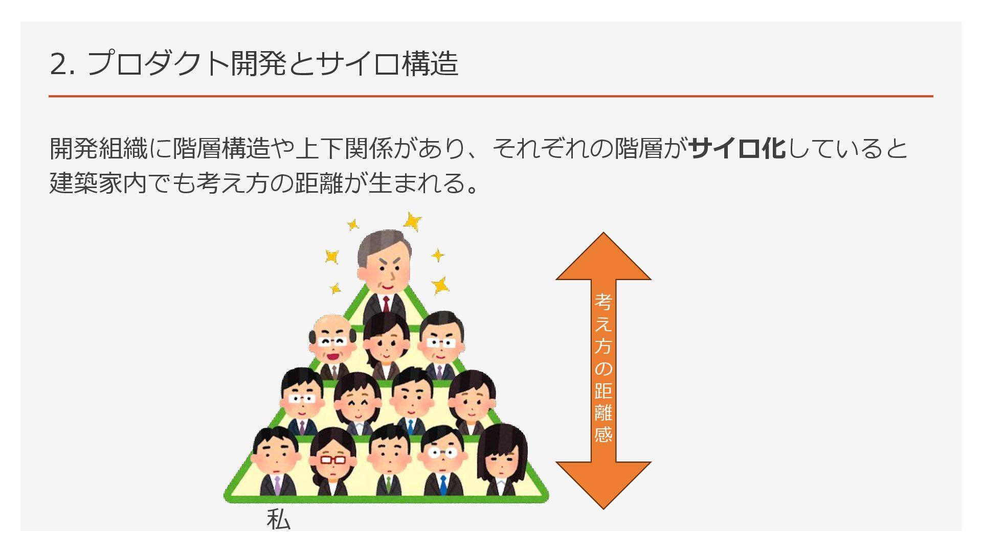 2. プロダクト開発とサイロ構造 開発組織に階層構造や上下関係があり、それぞれの階層がサイロ化していると 建築家内でも考え方の距離が生まれる。 考 え 方 の 距 離
