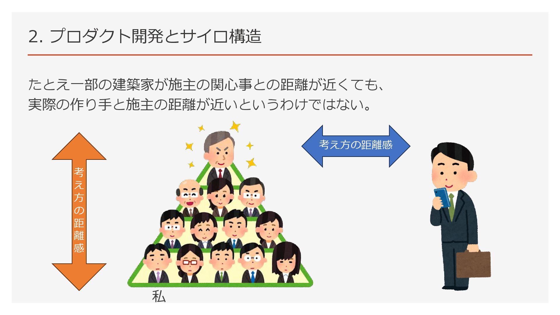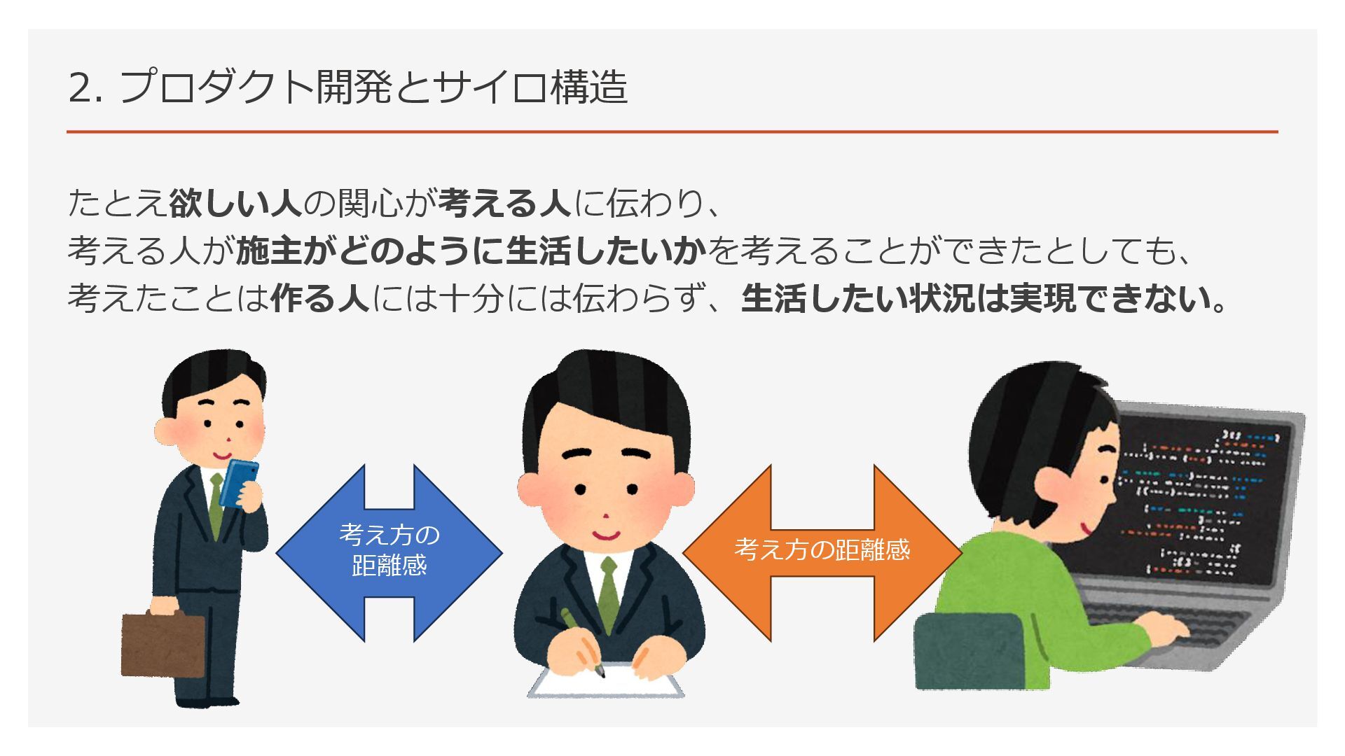 2. プロダクト開発とサイロ構造 たとえ欲しい人の関心が考える人に伝わり、 考える人が施主がどのように生活したいかを考えることができたとしても、 考えたことは作る人には十分には伝わらず、生活したい状況は実現できない。 考え方の距離感 考え方の 距離感