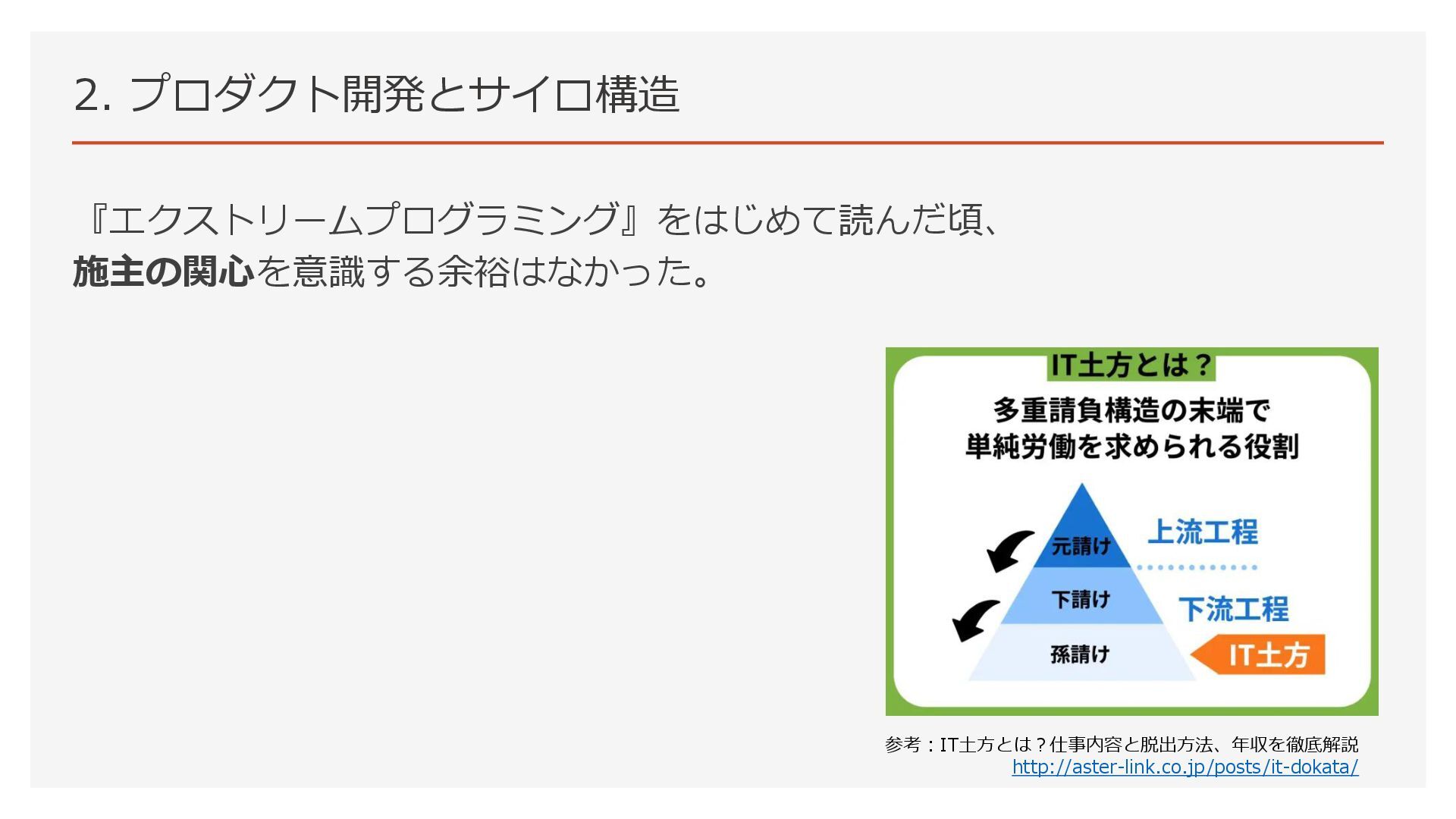 2. プロダクト開発とサイロ構造 『エクストリームプログラミング』をはじめて読んだ頃、 施主の関心を意識する余裕はなかった。 参考:IT土方とは?仕事内容と脱出方法、年収を徹底解説 http://aster-link.co.jp/posts/it-dokata/