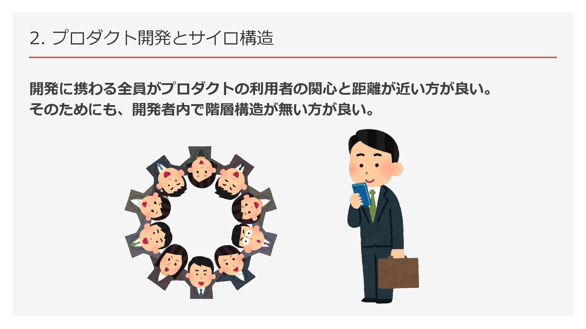 2. プロダクト開発とサイロ構造 開発に携わる全員がプロダクトの利用者の関心と距離が近い方が良い。 そのためにも、開発者内で階層構造が無い方が良い。