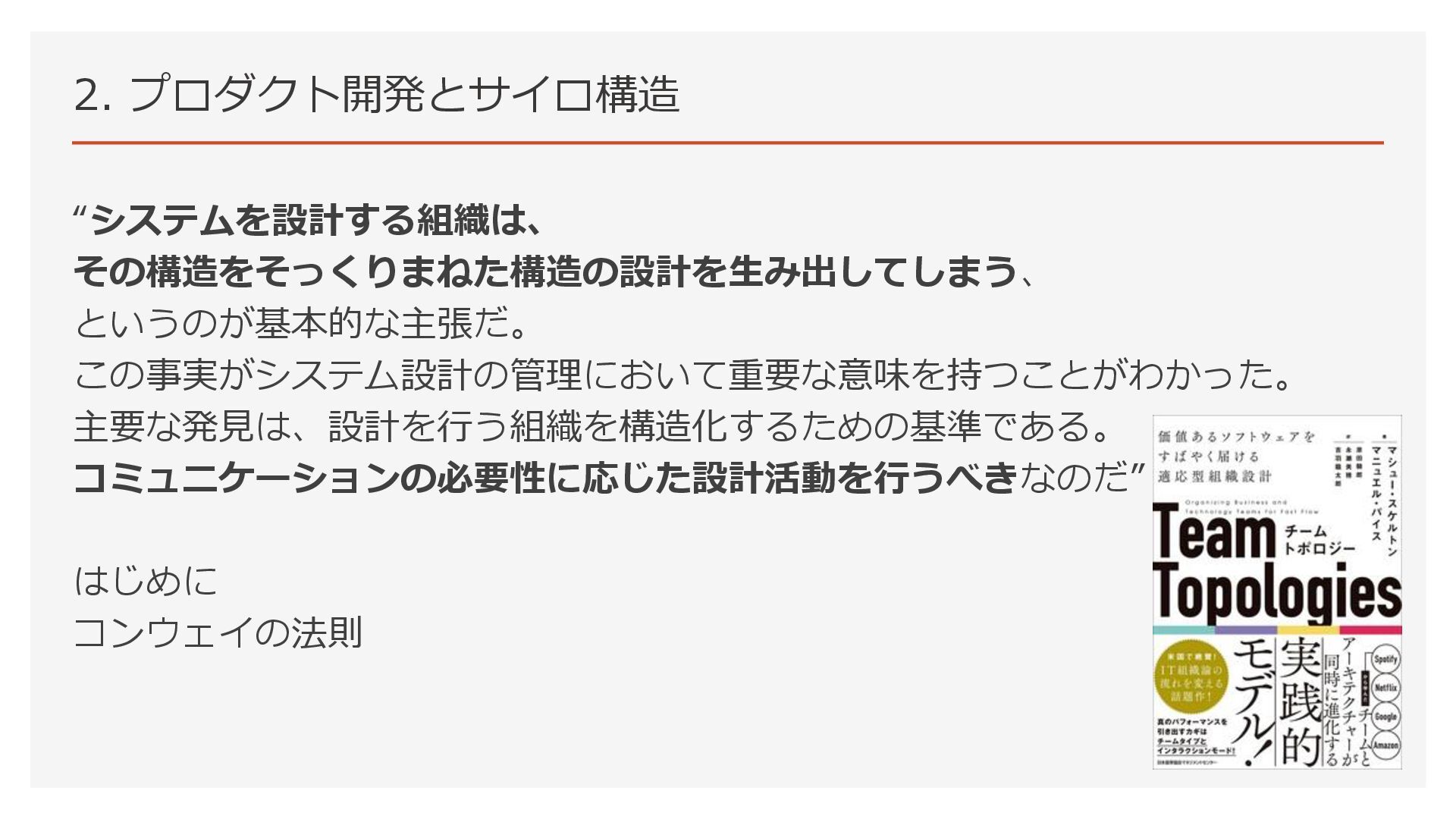 2. プロダクト開発とサイロ構造 “システムを設計する組織は、 その構造をそっくりまねた構造の設計を生み出してしまう、 というのが基本的な主張だ。 この事実がシステム設計の管理において重要な意味を持つことがわかった。 主要な発見は、設計を行う組織を構造化するための基準である。 コミュニケーションの必要性に応じた設計活動を行うべきなのだ” はじめに コンウェイの法則