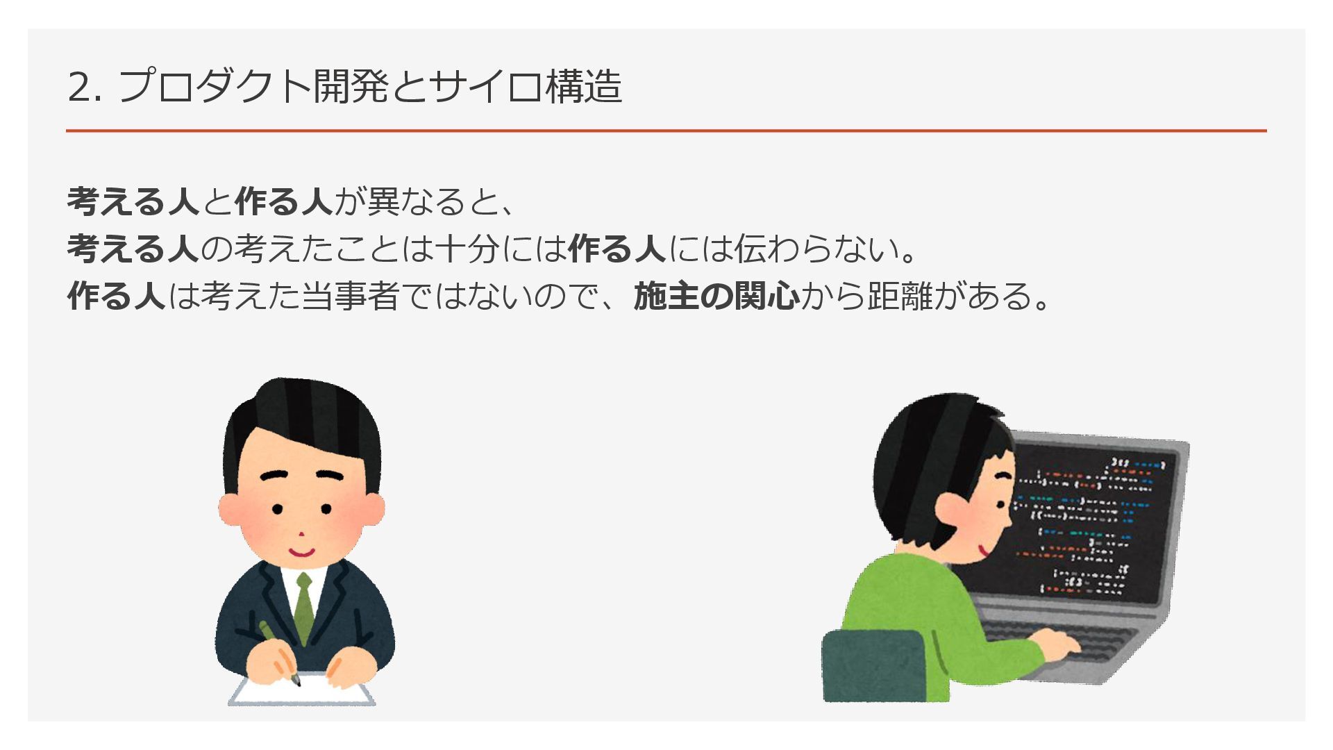 2. プロダクト開発とサイロ構造 考える人と作る人が異なると、 考える人の考えたことは十分には作る人には伝わらない。 作る人は考えた当事者ではないので、施主の関心から距離がある。