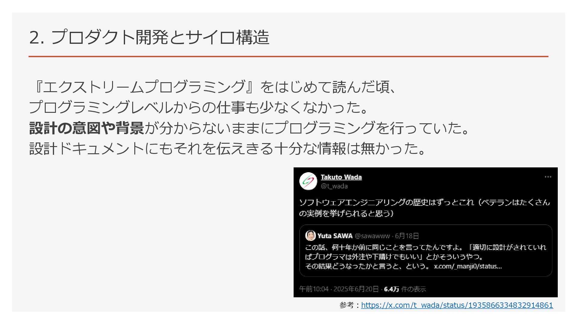2. プロダクト開発とサイロ構造 『エクストリームプログラミング』をはじめて読んだ頃、 プログラミングレベルからの仕事も少なくなかった。 設計の意図や背景が分からないままにプログラミングを行っていた。 設計ドキュメントにもそれを伝えきる十分な情報は無かった。 参考:https://x.com/t_wada/status/1935866334832914861