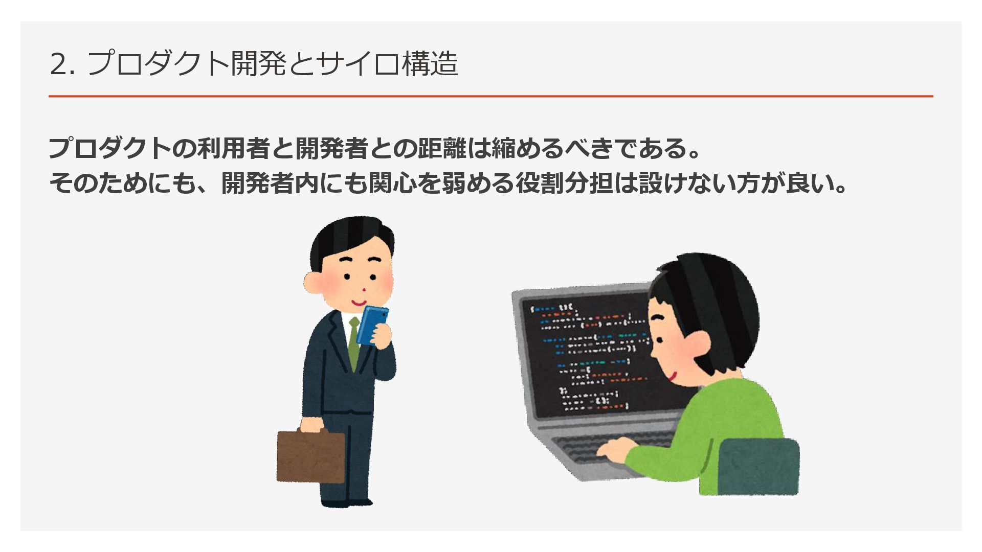 2. プロダクト開発とサイロ構造 プロダクトの利用者と開発者との距離は縮めるべきである。 そのためにも、開発者内にも関心を弱める役割分担は設けない方が良い。