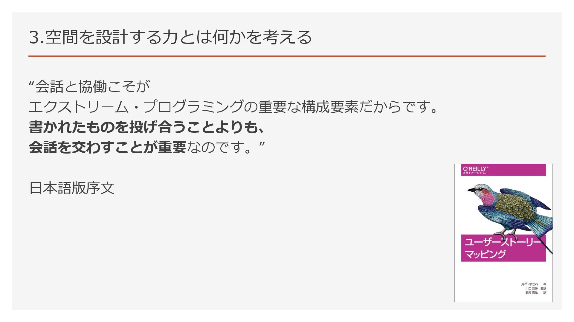 3.空間を設計する力とは何かを考える “会話と協働こそが エクストリーム・プログラミングの重要な構成要素だからです。 書かれたものを投げ合うことよりも、 会話を交わすことが重要なのです。” 日本語版序文