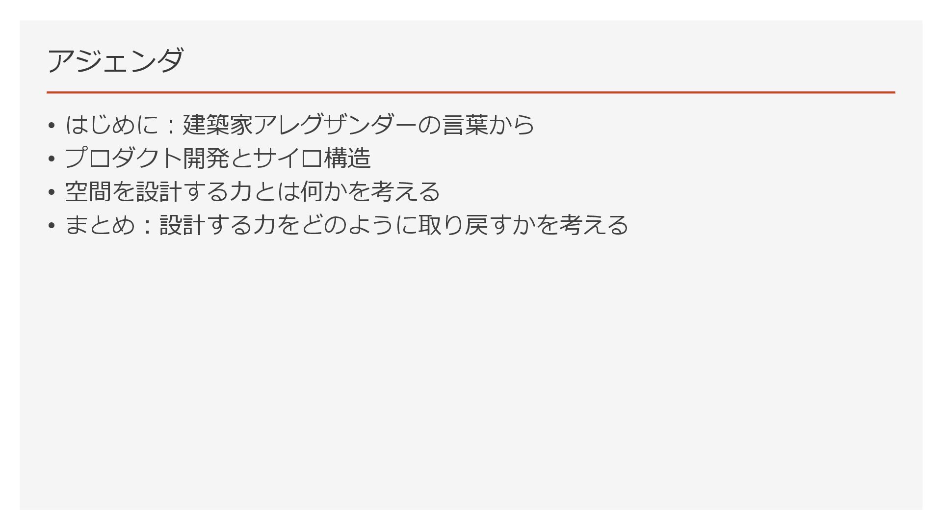 アジェンダ • はじめに:建築家アレグザンダーの言葉から • プロダクト開発とサイロ構造 • 空間を設計する力とは何かを考える • まとめ:設計する力をどのように取り戻すかを考える