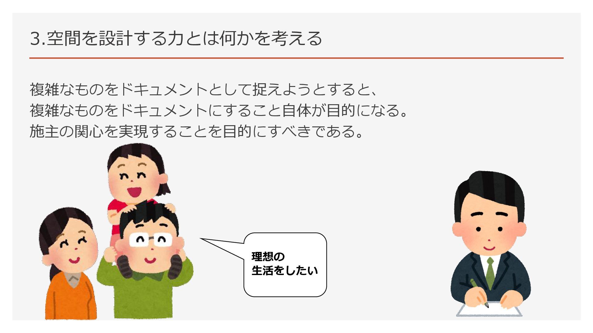 3.空間を設計する力とは何かを考える 複雑なものをドキュメントとして捉えようとすると、 複雑なものをドキュメントにすること自体が目的になる。 施主の関心を実現することを目的にすべきである。 理想の 生活をしたい