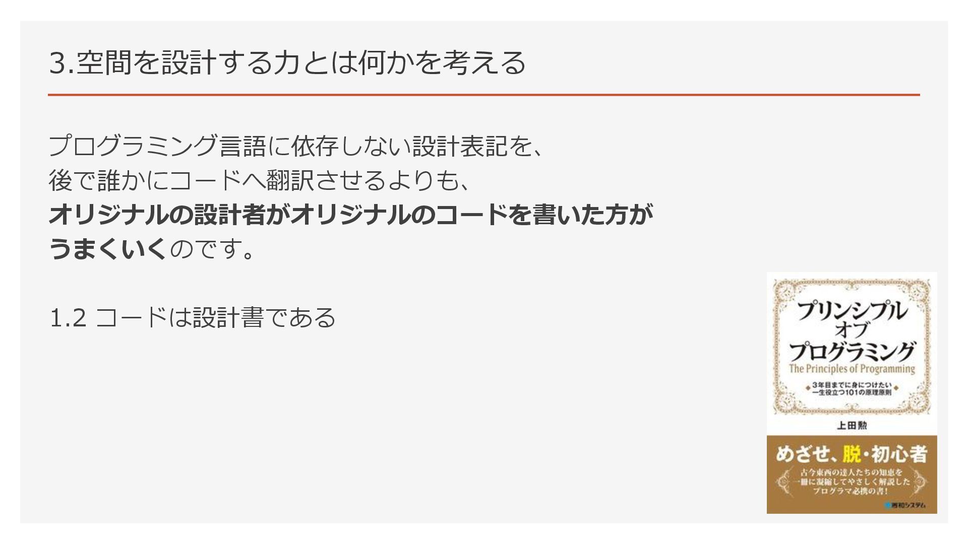 3.空間を設計する力とは何かを考える プログラミング言語に依存しない設計表記を、 後で誰かにコードへ翻訳させるよりも、 オリジナルの設計者がオリジナルのコードを書いた方が うまくいくのです。 1.2 コードは設計書である