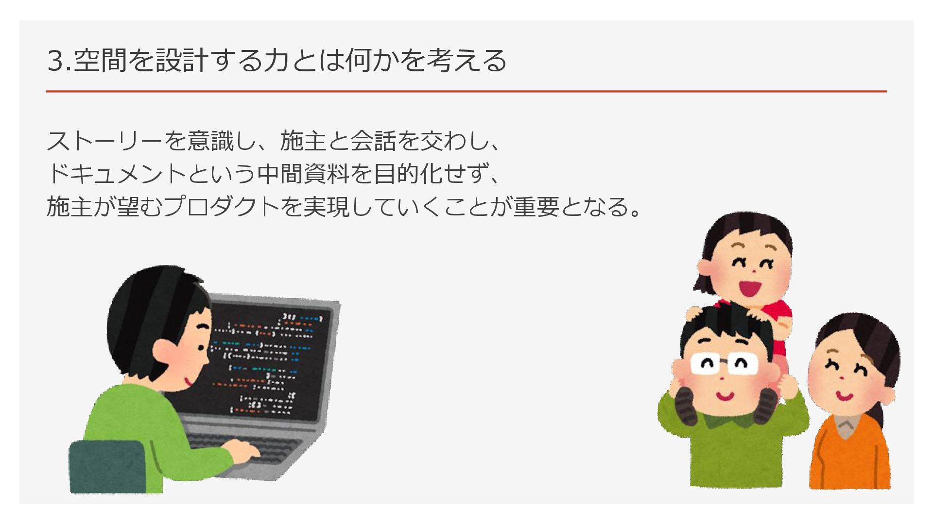 3.空間を設計する力とは何かを考える ストーリーを意識し、施主と会話を交わし、 ドキュメントという中間資料を目的化せず、 施主が望むプロダクトを実現していくことが重要となる。