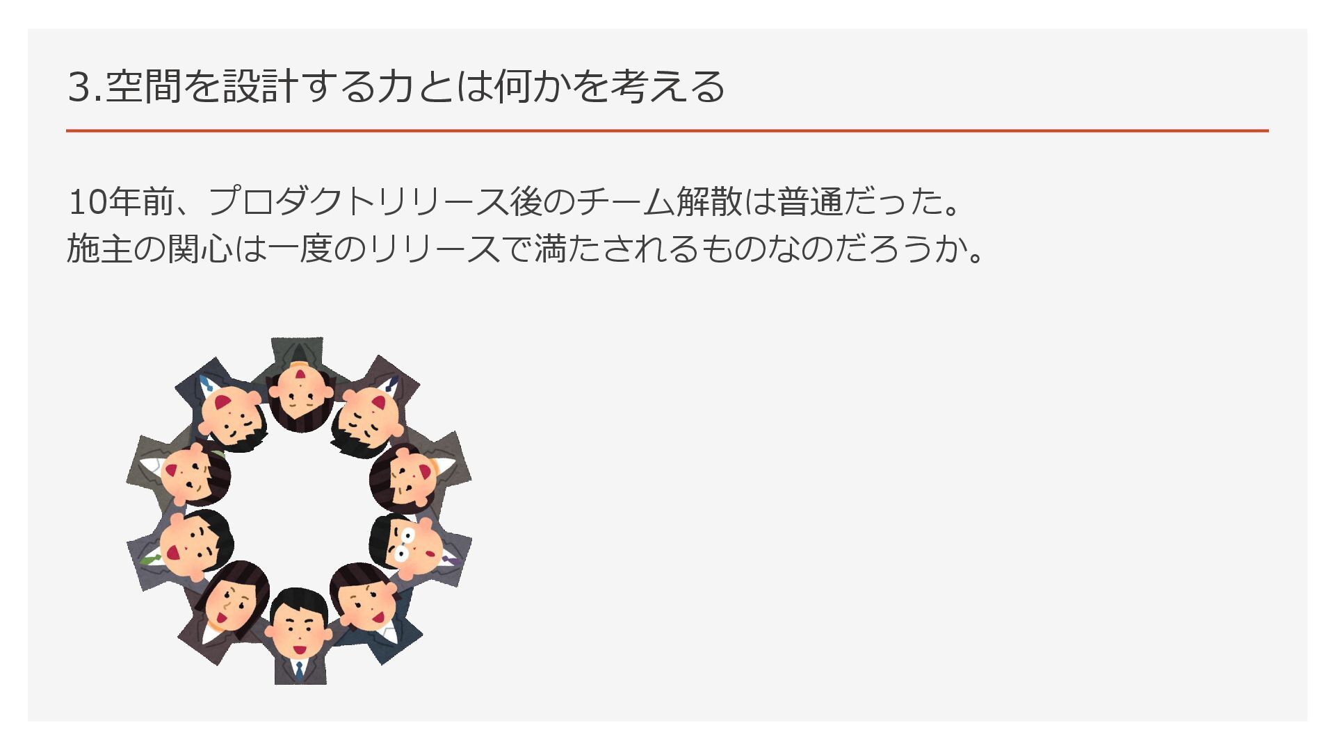 3.空間を設計する力とは何かを考える 10年前、プロダクトリリース後のチーム解散は普通だった。 施主の関心は一度のリリースで満たされるものなのだろうか。