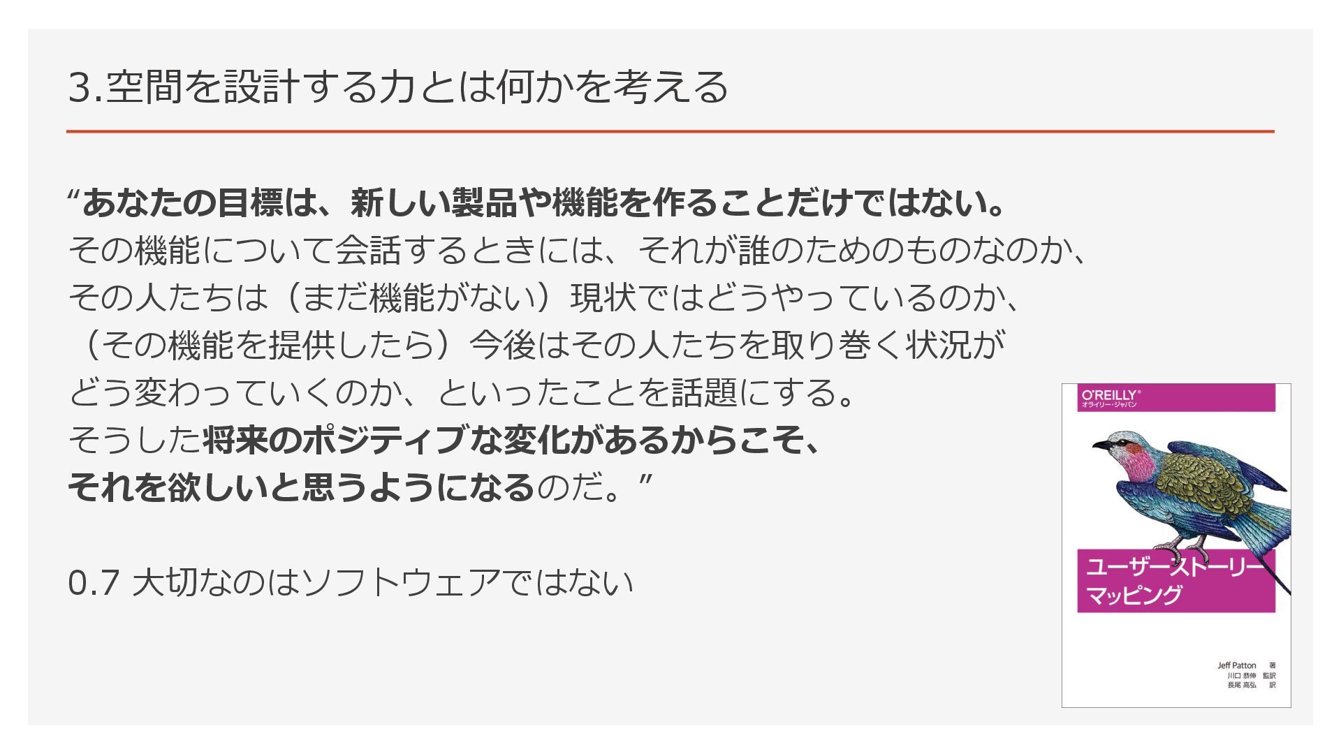 3.空間を設計する力とは何かを考える “あなたの目標は、新しい製品や機能を作ることだけではない。 その機能について会話するときには、それが誰のためのものなのか、 その人たちは(まだ機能がない)現状ではどうやっているのか、 (その機能を提供したら)今後はその人たちを取り巻く状況が どう変わっていくのか、といったことを話題にする。 そうした将来のポジティブな変化があるからこそ、 それを欲しいと思うようになるのだ。” 0.7 大切なのはソフトウェアではない