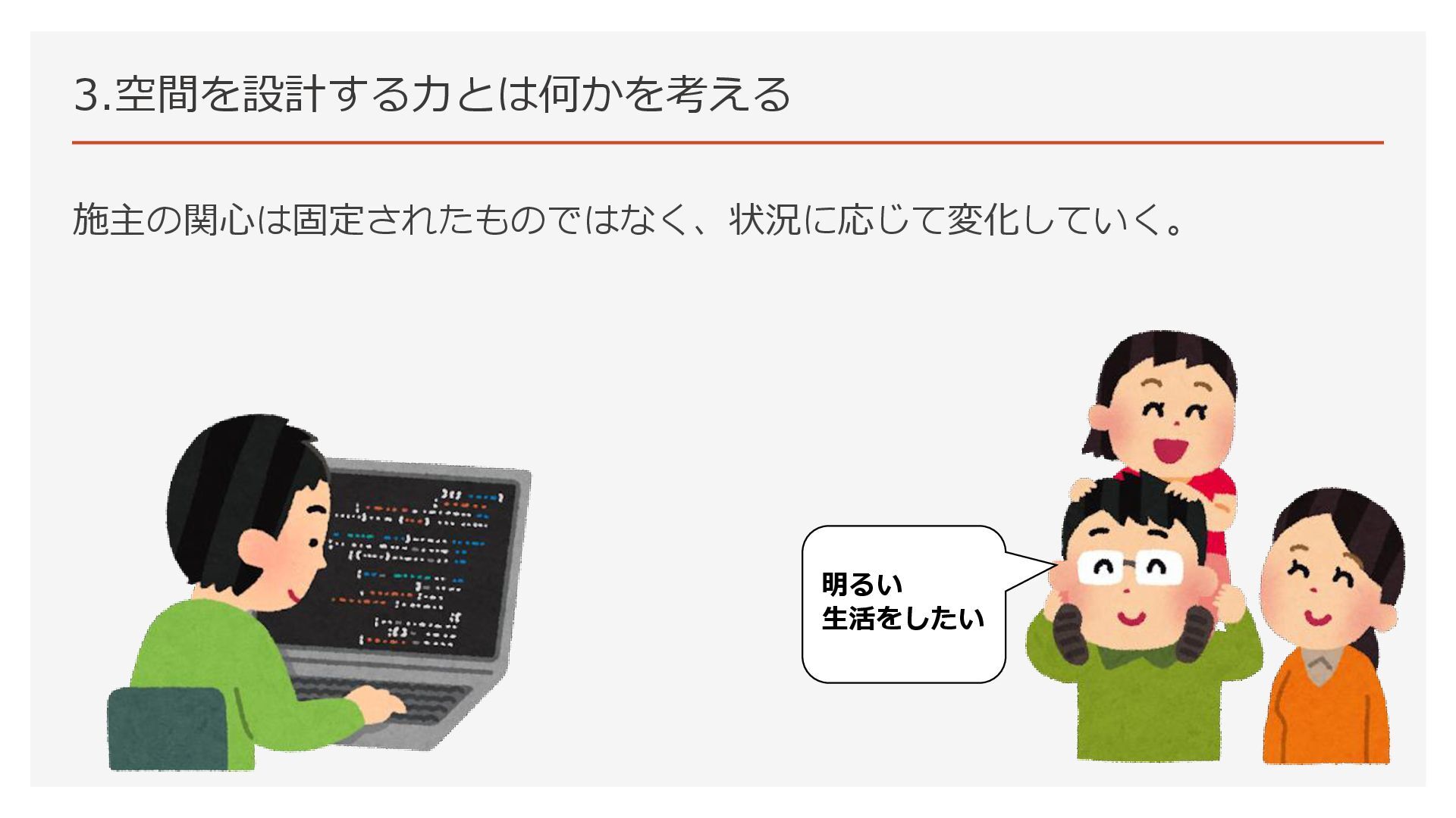 3.空間を設計する力とは何かを考える 施主の関心は固定されたものではなく、状況に応じて変化していく。 明るい 生活をしたい
