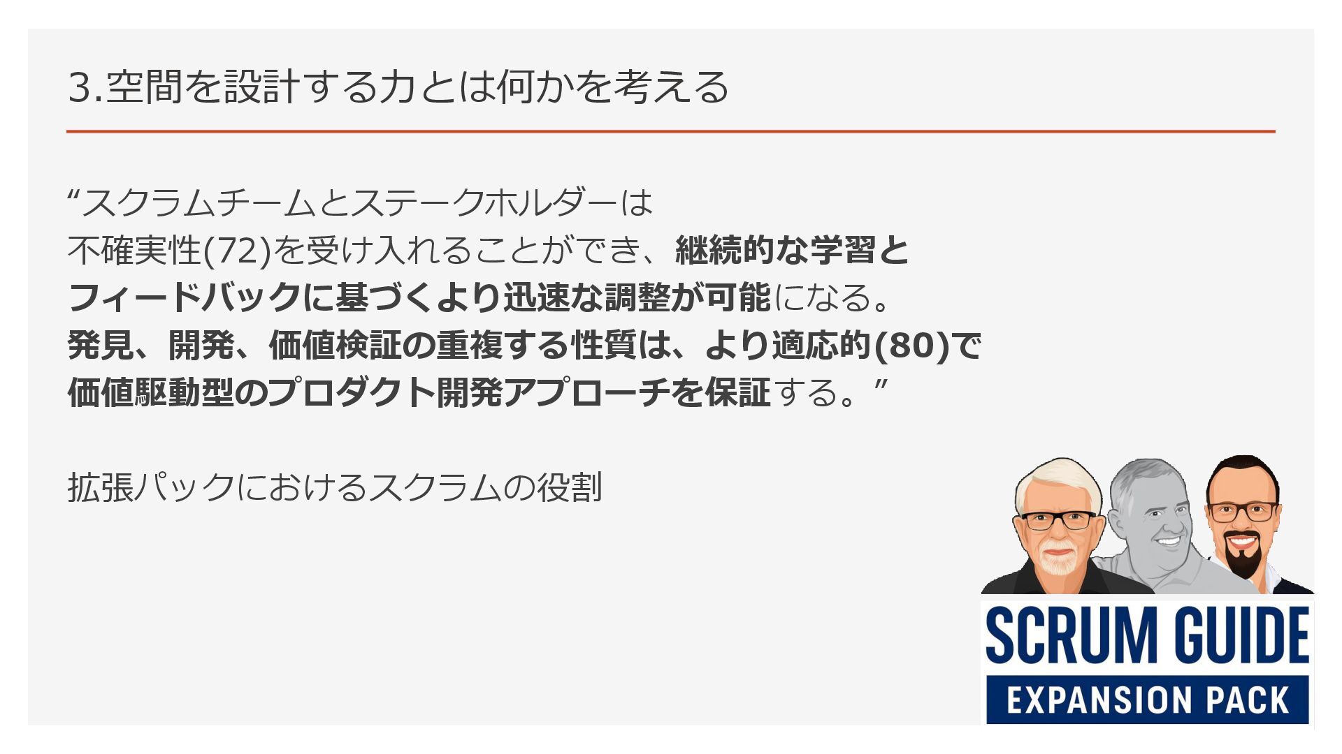 3.空間を設計する力とは何かを考える “スクラムチームとステークホルダーは 不確実性(72)を受け入れることができ、継続的な学習と フィードバックに基づくより迅速な調整が可能になる。 発見、開発、価値検証の重複する性質は、より適応的(80)で 価値駆動型のプロダクト開発アプローチを保証する。” 拡張パックにおけるスクラムの役割