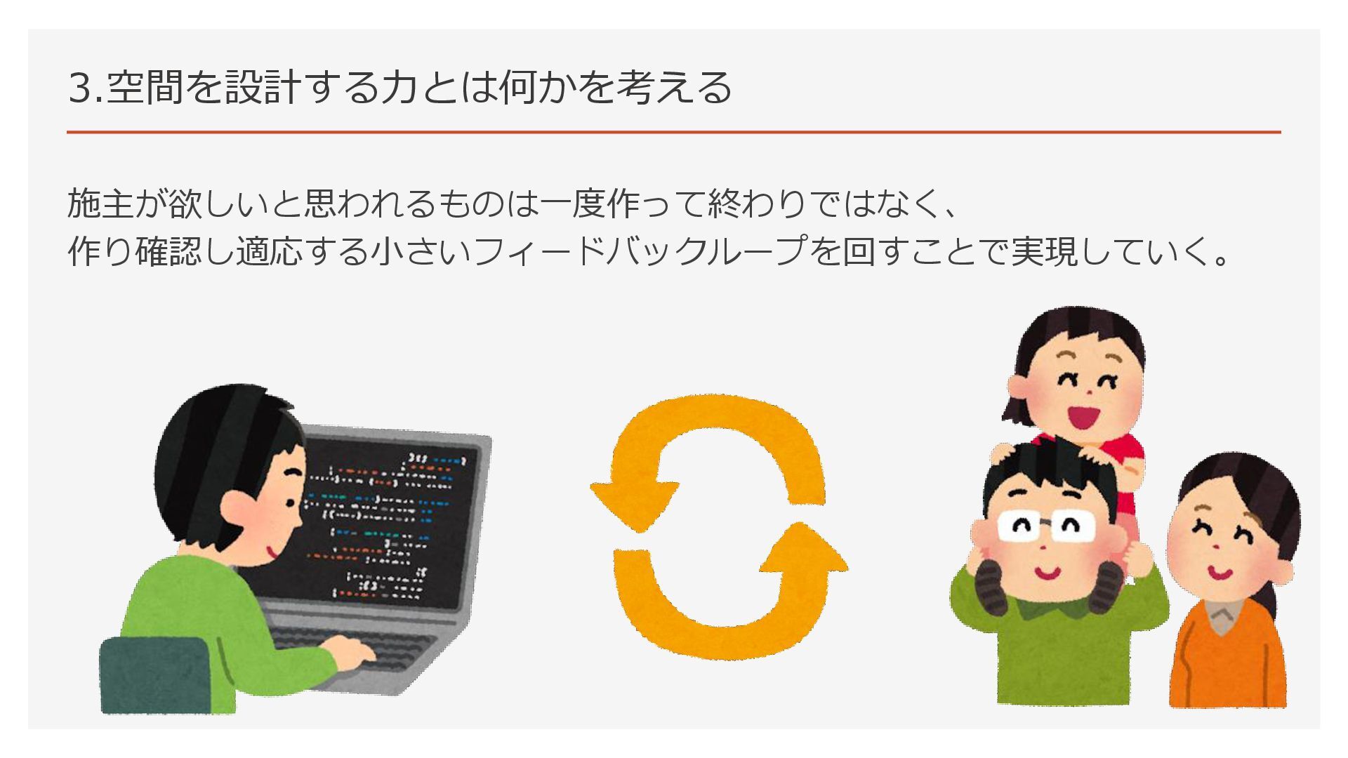 3.空間を設計する力とは何かを考える 施主が欲しいと思われるものは一度作って終わりではなく、 作り確認し適応する小さいフィードバックループを回すことで実現していく。