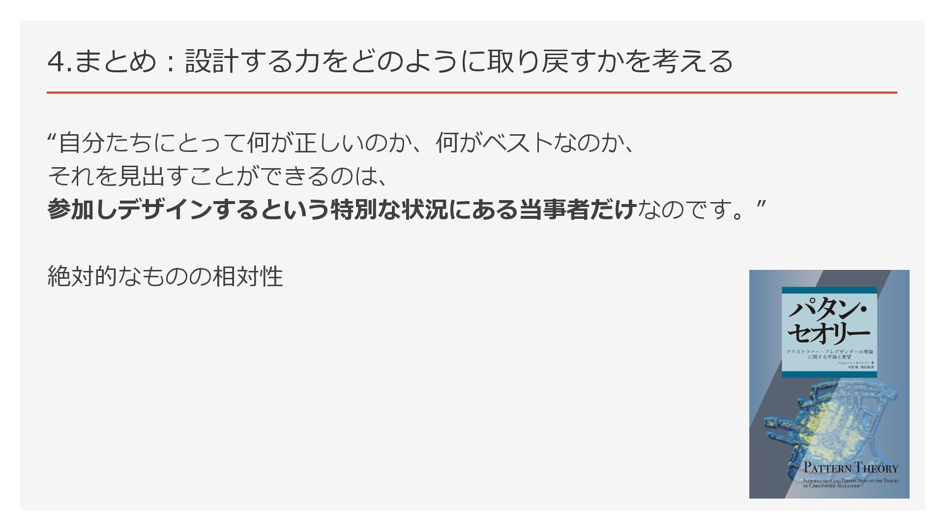 “自分たちにとって何が正しいのか、何がベストなのか、 それを見出すことができるのは、 参加しデザインするという特別な状況にある当事者だけなのです。” 絶対的なものの相対性 4.まとめ:設計する力をどのように取り戻すかを考える