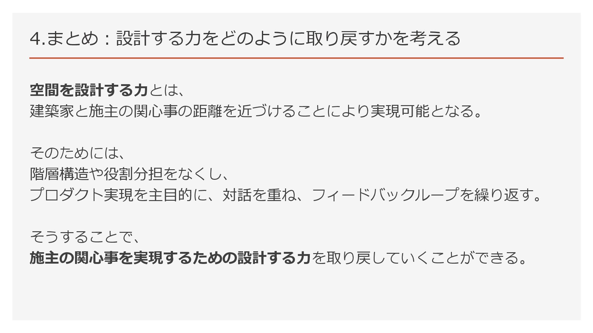 空間を設計する力とは、 建築家と施主の関心事の距離を近づけることにより実現可能となる。 そのためには、 階層構造や役割分担をなくし、 プロダクト実現を主目的に、対話を重ね、フィードバックループを繰り返す。 そうすることで、 施主の関心事を実現するための設計する力を取り戻していくことができる。 4.まとめ:設計する力をどのように取り戻すかを考える