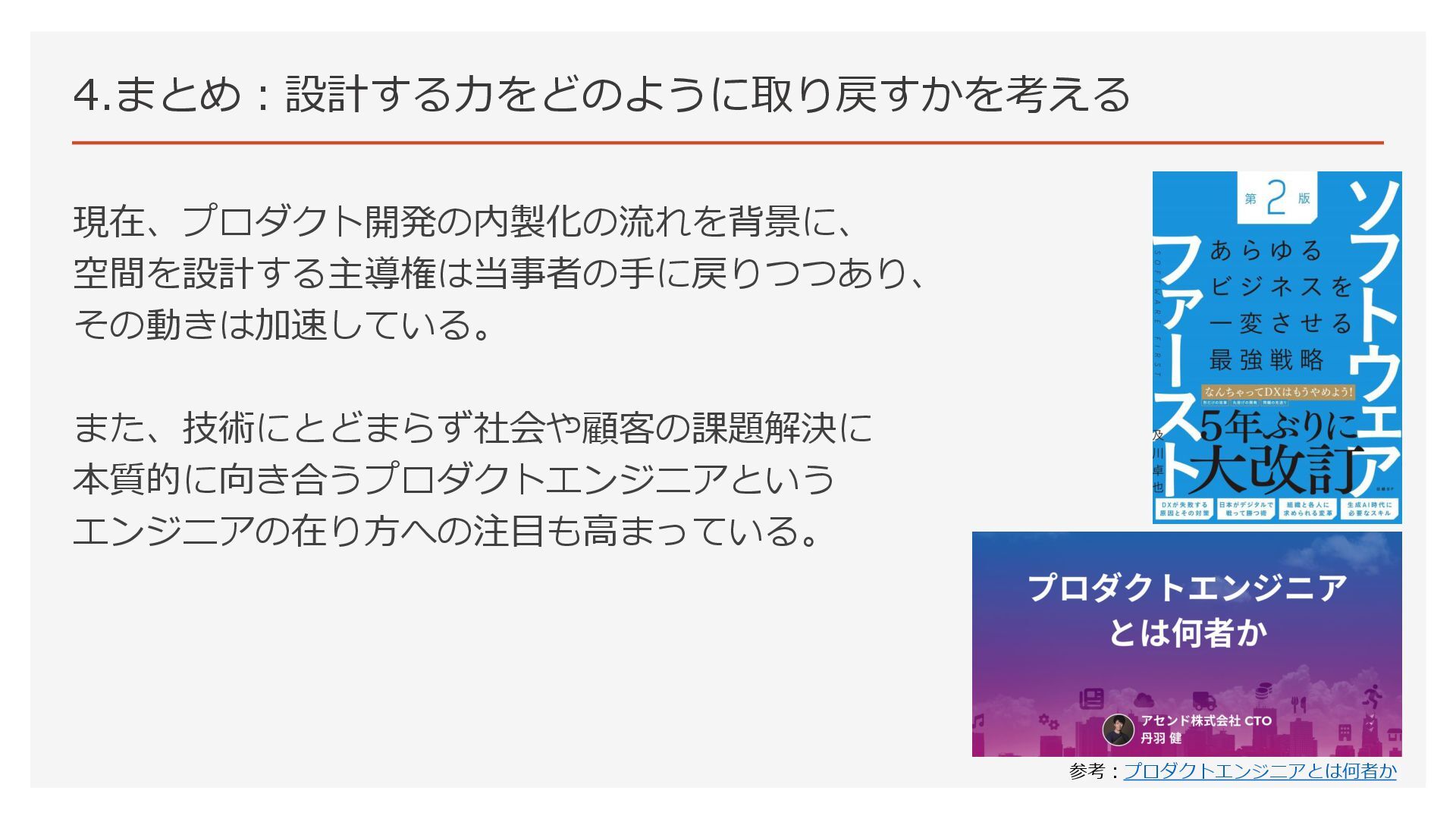 現在、プロダクト開発の内製化の流れを背景に、 空間を設計する主導権は当事者の手に戻りつつあり、 その動きは加速している。 また、技術にとどまらず社会や顧客の課題解決に 本質的に向き合うプロダクトエンジニアという エンジニアの在り方への注目も高まっている。 4.まとめ:設計する力をどのように取り戻すかを考える 参考:プロダクトエンジニアとは何者か