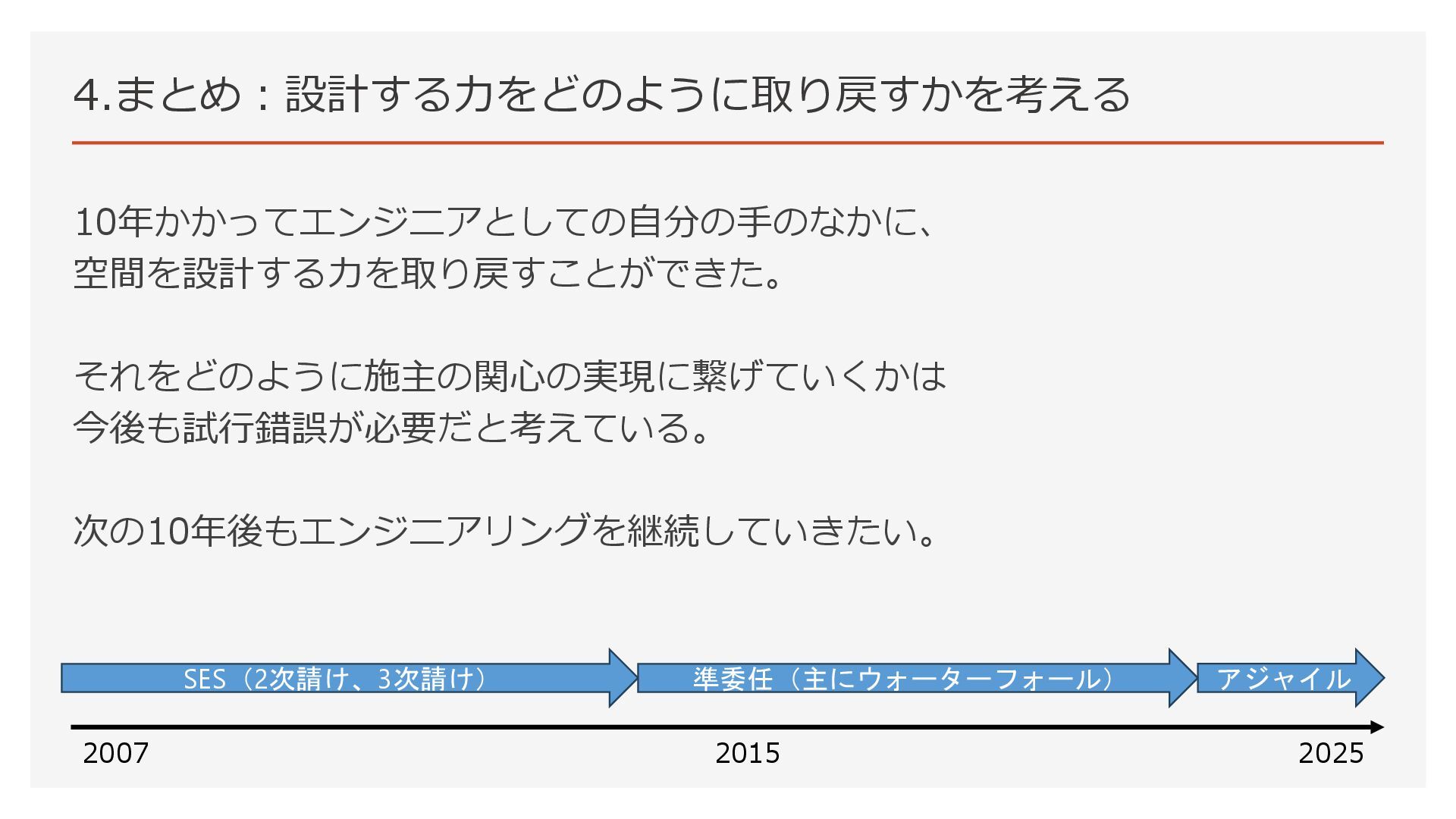 10年かかってエンジニアとしての自分の手のなかに、 空間を設計する力を取り戻すことができた。 それをどのように施主の関心の実現に繋げていくかは 今後も試行錯誤が必要だと考えている。 次の10年後もエンジニアリングを継続していきたい。 2007 2025 2015 SES(2次請け、3次請け) 準委任(主にウォーターフォール)