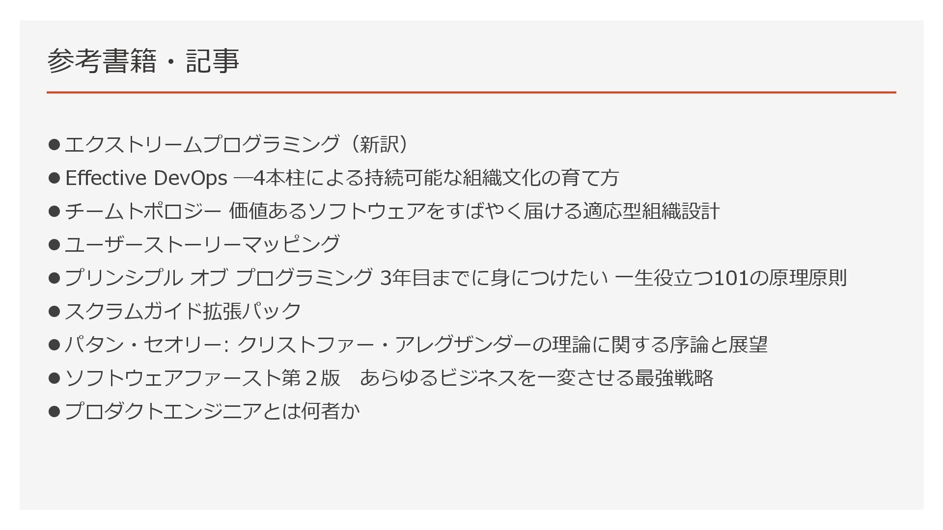 ユーザーストーリーマッピング ⚫ プリンシプル オブ プログラミング 3年目までに身につけたい 一生役立つ101の原理原則 ⚫ スクラムガイド拡張パック ⚫ パタン・セオリー: クリストファー・アレグザンダーの理論に関する序論と展望 ⚫ ソフトウェアファースト第2版 あらゆるビジネスを一変させる最強戦略 ⚫ プロダクトエンジニアとは何者か 参考書籍・記事
