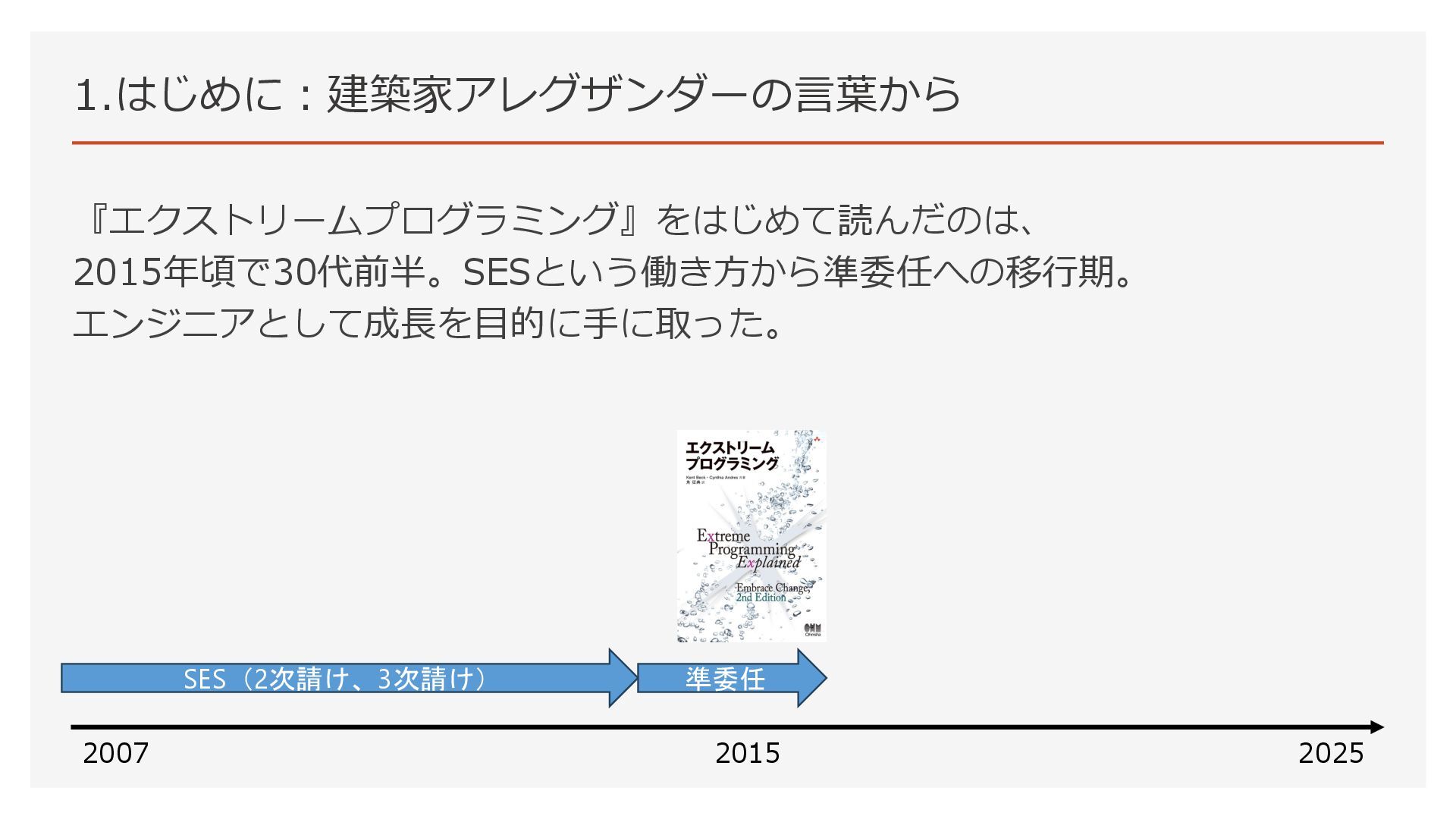 1.はじめに:建築家アレグザンダーの言葉から 『エクストリームプログラミング』をはじめて読んだのは、 2015年頃で30代前半。SESという働き方から準委任への移行期。 エンジニアとして成長を目的に手に取った。 2007 2025 2015 SES(2次請け、3次請け) 準委任