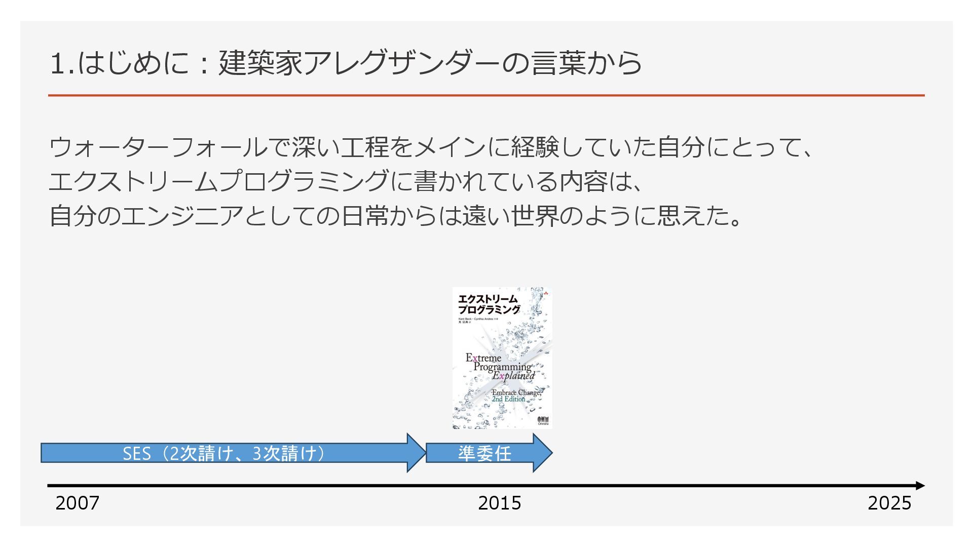 1.はじめに:建築家アレグザンダーの言葉から ウォーターフォールで深い工程をメインに経験していた自分にとって、 エクストリームプログラミングに書かれている内容は、 自分のエンジニアとしての日常からは遠い世界のように思えた。 2007 2025 2015 SES(2次請け、3次請け) 準委任