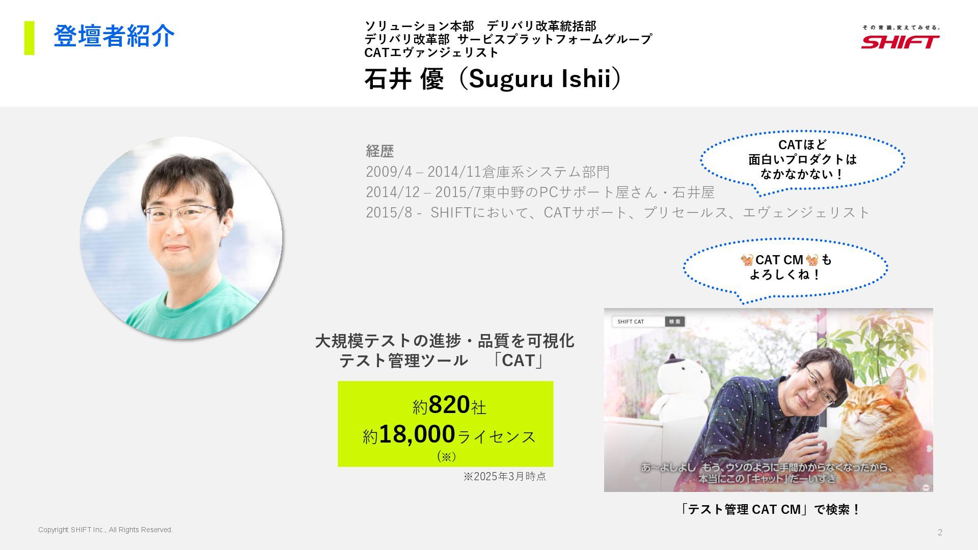 – 2014/11倉庫系システム部門 2014/12 – 2015/7東中野のPCサポート屋さん・石井屋 2015/8 - SHIFTにおいて、CATサポート、プリセールス、エヴェンジェリスト 石井 優(Suguru Ishii) ソリューション本部 デリバリ改革統括部 デリバリ改革部 サービスプラットフォームグループ CATエヴァンジェリスト CATほど 面白いプロダクトは なかなかない! 大規模テストの進捗・品質を可視化 テスト管理ツール 「CAT」 約820社 約18,000ライセンス (※) ※2025年3月時点 CAT CM も よろしくね! 「テスト管理 CAT CM」で検索!