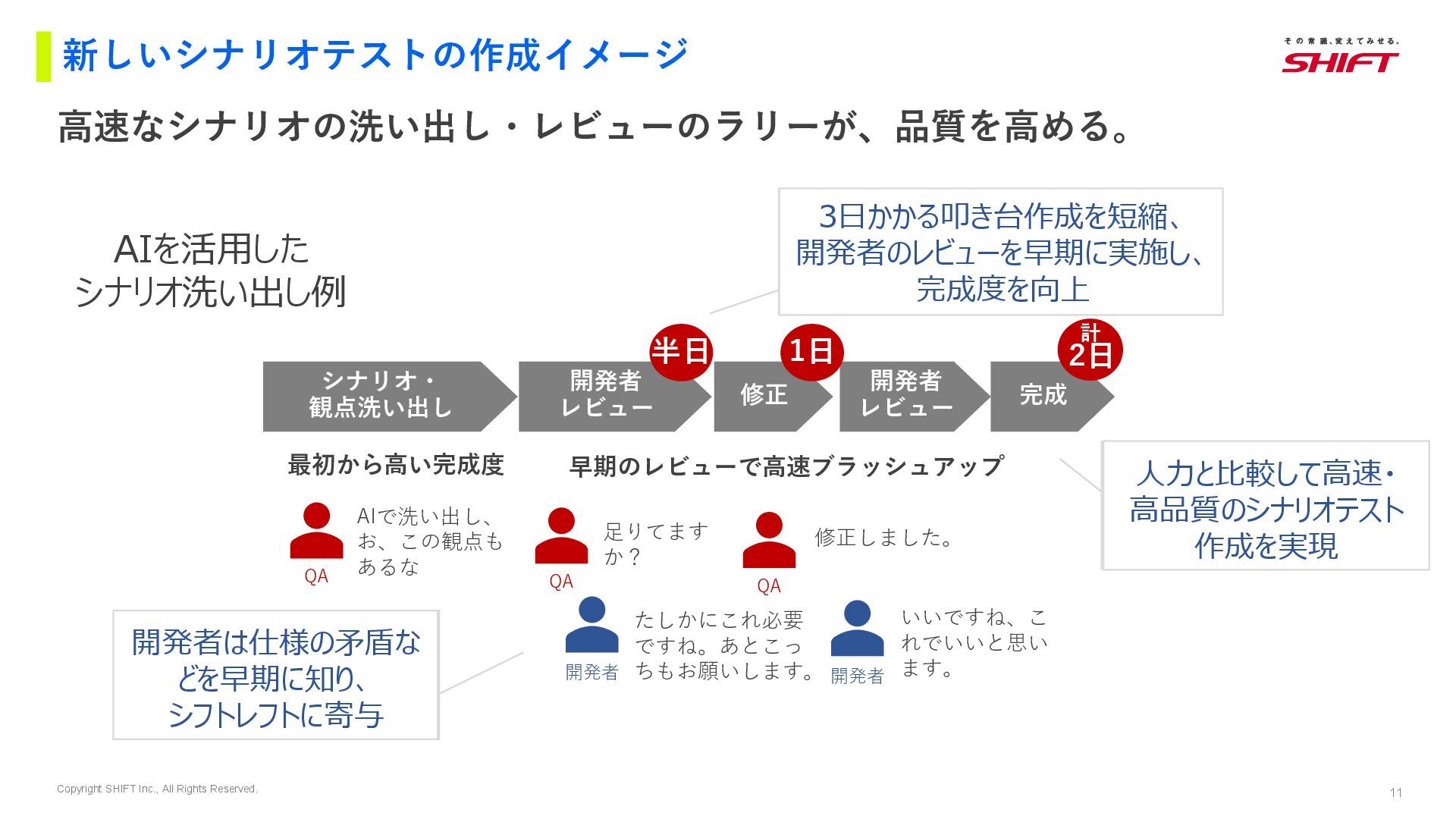 開発者 レビュー 修正 開発者 レビュー 完成 QA AIで洗い出し、 お、この観点も あるな QA 足りてます か? たしかにこれ必要 ですね。あとこっ ちもお願いします。 開発者 QA 修正しました。 いいですね、こ れでいいと思い ます。 開発者 半日 計 2日 最初から高い完成度 早期のレビューで高速ブラッシュアップ 1日 AIを活用した シナリオ洗い出し例 3日かかる叩き台作成を短縮、 開発者のレビューを早期に実施し、 完成度を向上 開発者は仕様の矛盾な どを早期に知り、 シフトレフトに寄与 人力と比較して高速・ 高品質のシナリオテスト 作成を実現 高速なシナリオの洗い出し・レビューのラリーが、品質を高める。