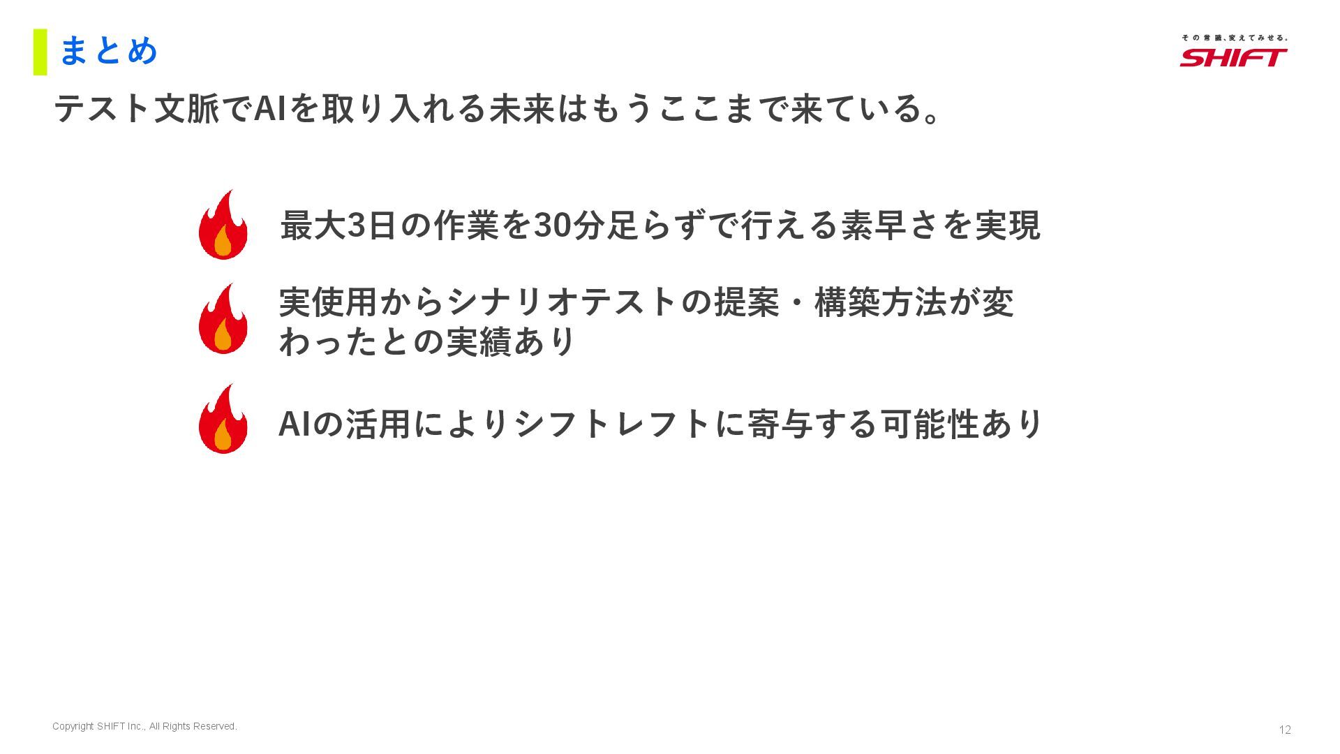 12 Copyright SHIFT Inc., All Rights Reserved. まとめ テスト文脈でAIを取り入れる未来はもうここまで来ている。 お土産