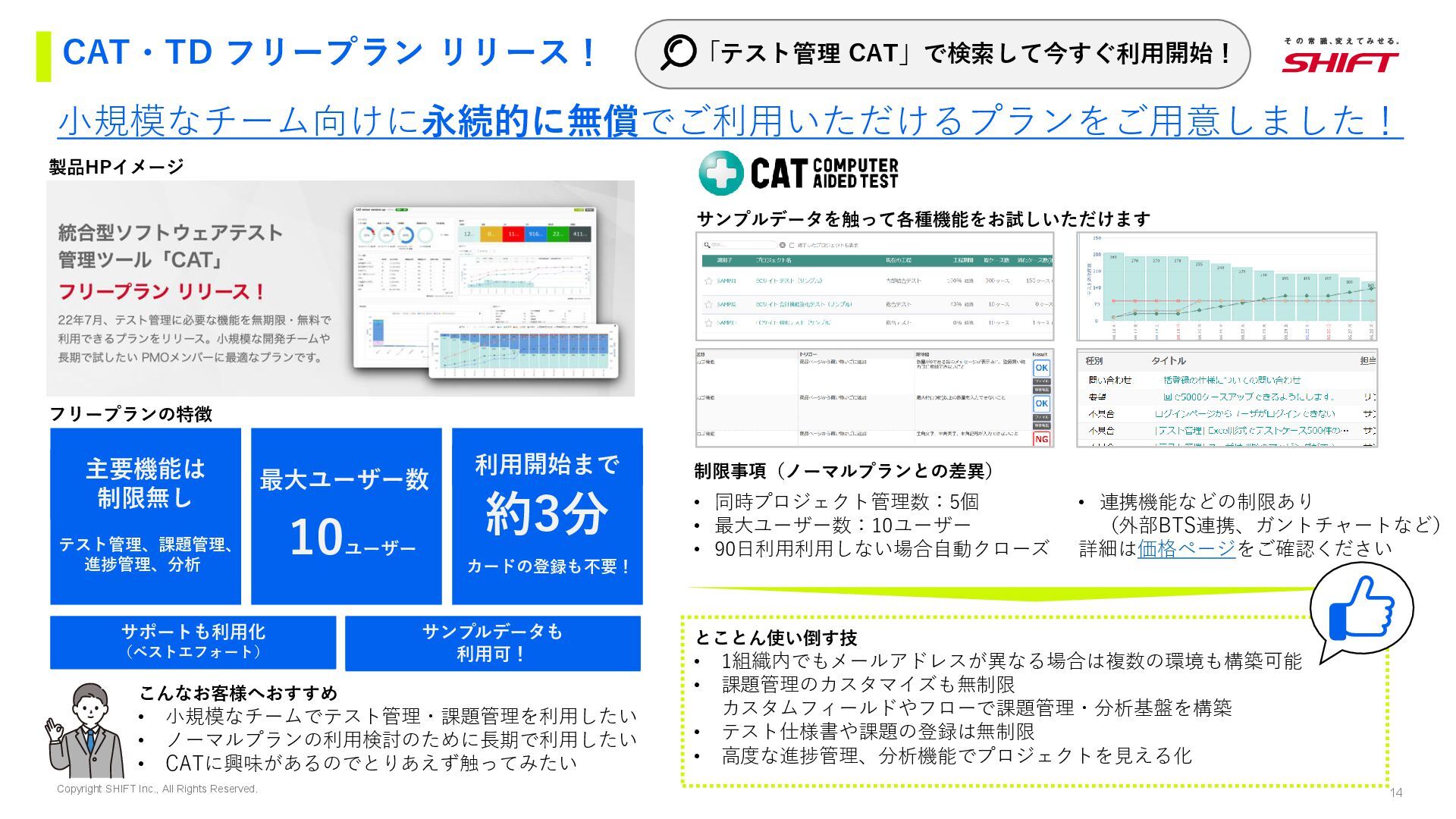 14 Copyright SHIFT Inc., All Rights Reserved. CAT・TD フリープラン リリース!