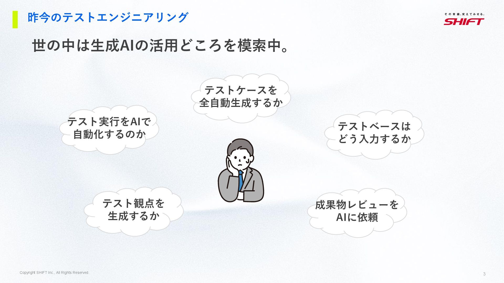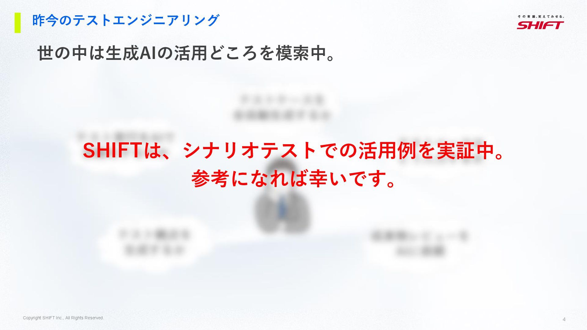 3 Copyright SHIFT Inc., All Rights Reserved. 昨今のテストエンジニアリング 世の中は生成AIの活用どころを模索中。 テスト実行をAIで