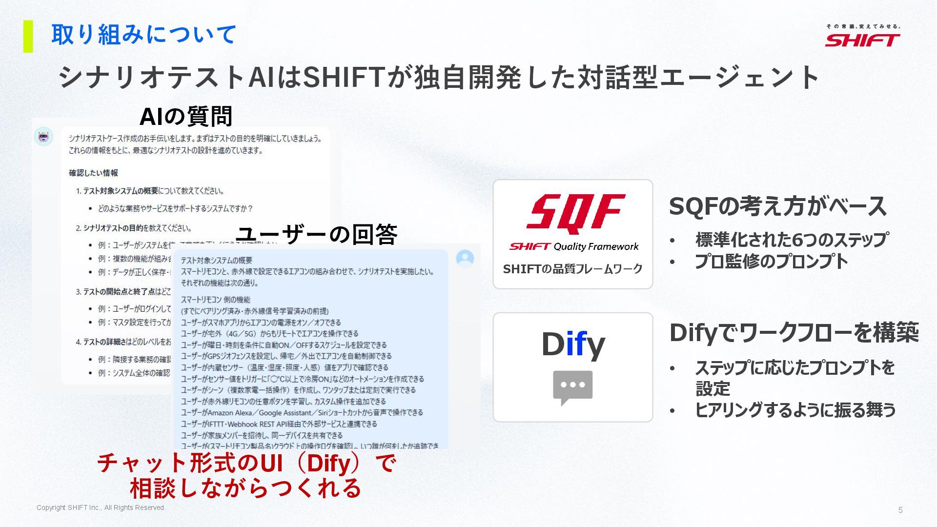 5 Copyright SHIFT Inc., All Rights Reserved. 取り組みについて シナリオテストAIはSHIFTが独自開発した対話型エージェント AIの質問