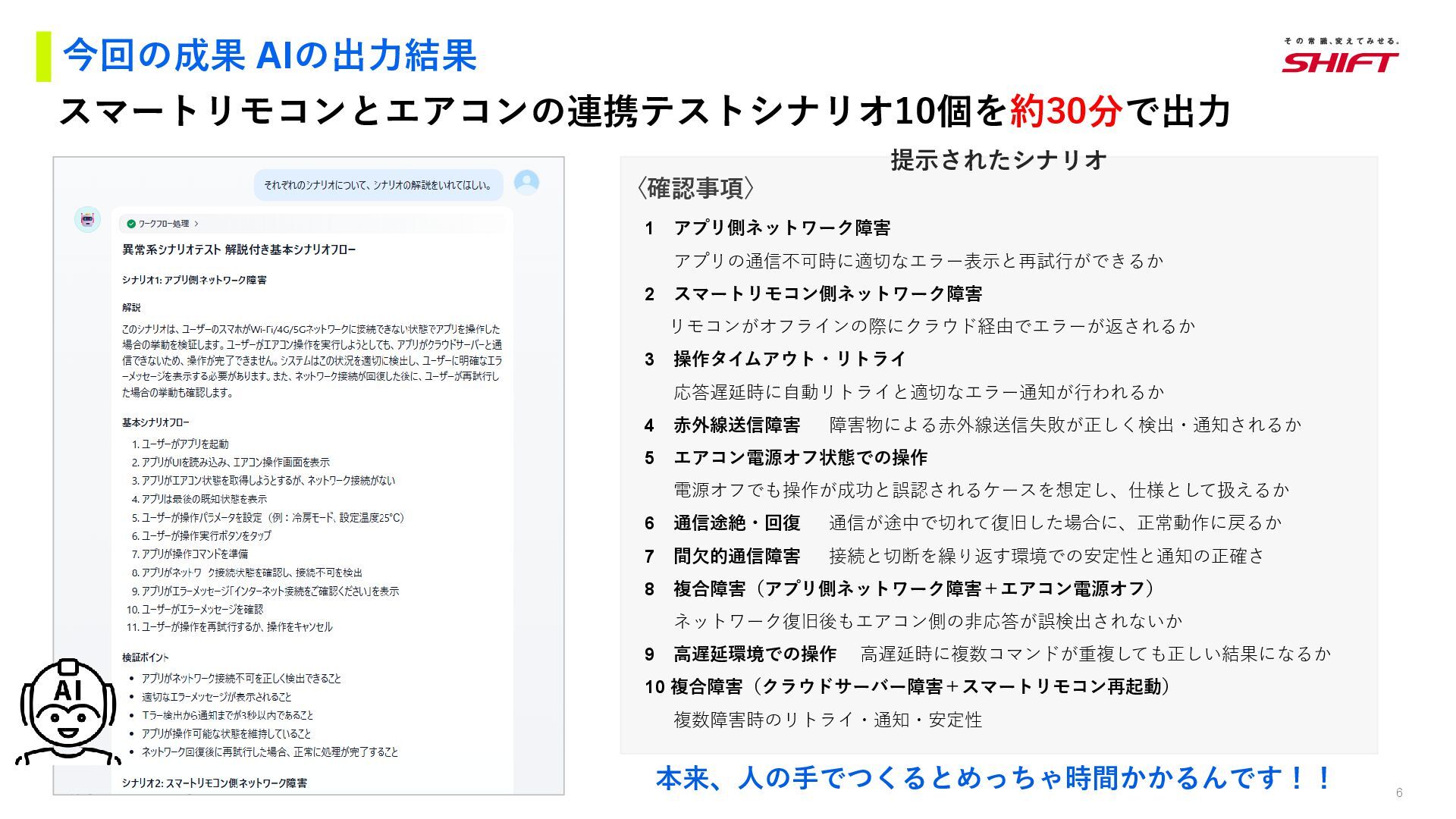 2 スマートリモコン側ネットワーク障害 リモコンがオフラインの際にクラウド経由でエラーが返されるか 3 操作タイムアウト・リトライ 応答遅延時に自動リトライと適切なエラー通知が行われるか 4 赤外線送信障害 障害物による赤外線送信失敗が正しく検出・通知されるか 5 エアコン電源オフ状態での操作 電源オフでも操作が成功と誤認されるケースを想定し、仕様として扱えるか 6 通信途絶・回復 通信が途中で切れて復旧した場合に、正常動作に戻るか 7 間欠的通信障害 接続と切断を繰り返す環境での安定性と通知の正確さ 8 複合障害(アプリ側ネットワーク障害+エアコン電源オフ) ネットワーク復旧後もエアコン側の非応答が誤検出されないか 9 高遅延環境での操作 高遅延時に複数コマンドが重複しても正しい結果になるか 10 複合障害(クラウドサーバー障害+スマートリモコン再起動) 複数障害時のリトライ・通知・安定性 本来、人の手でつくるとめっちゃ時間かかるんです!! 〈確認事項〉 今回の成果 AIの出力結果 スマートリモコンとエアコンの連携テストシナリオ10個を約30分で出力 提示されたシナリオ