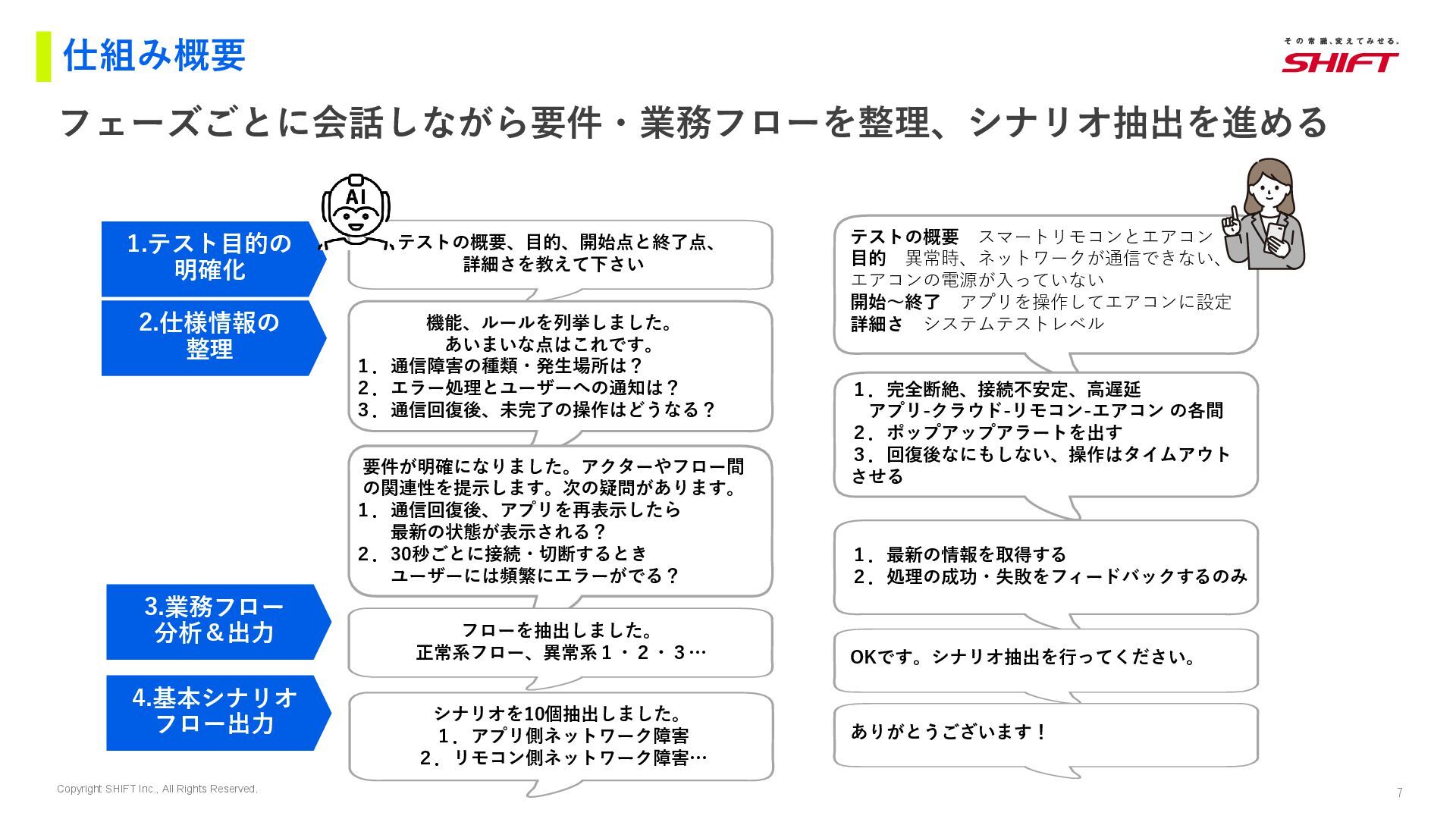 7 Copyright SHIFT Inc., All Rights Reserved. 仕組み概要 フェーズごとに会話しながら要件・業務フローを整理、シナリオ抽出を進める テストの概要、目的、開始点と終了点、