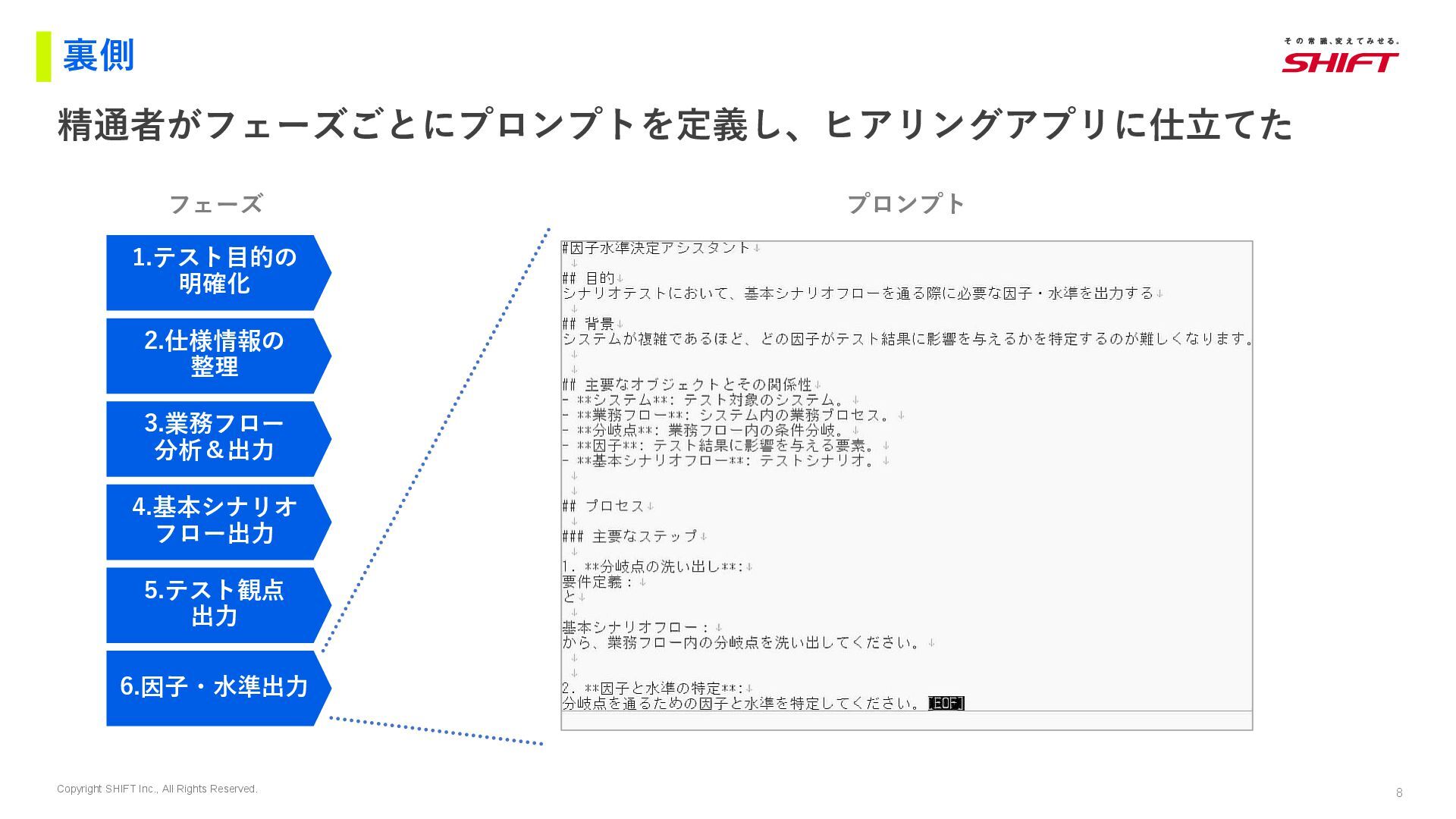 8 Copyright SHIFT Inc., All Rights Reserved. 裏側 精通者がフェーズごとにプロンプトを定義し、ヒアリングアプリに仕立てた フェーズ