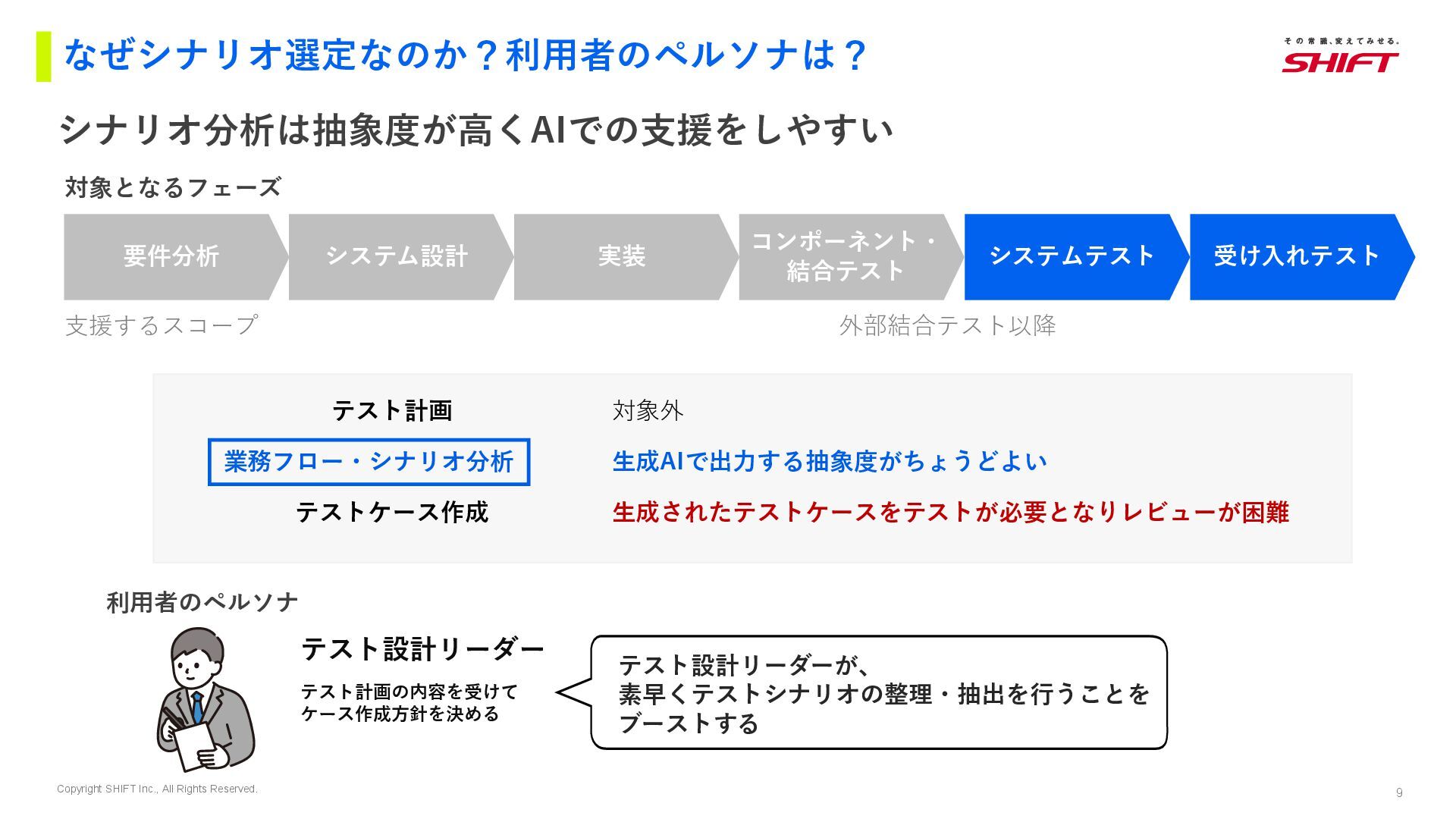 9 Copyright SHIFT Inc., All Rights Reserved. なぜシナリオ選定なのか?利用者のペルソナは? シナリオ分析は抽象度が高くAIでの支援をしやすい 利用者のペルソナ