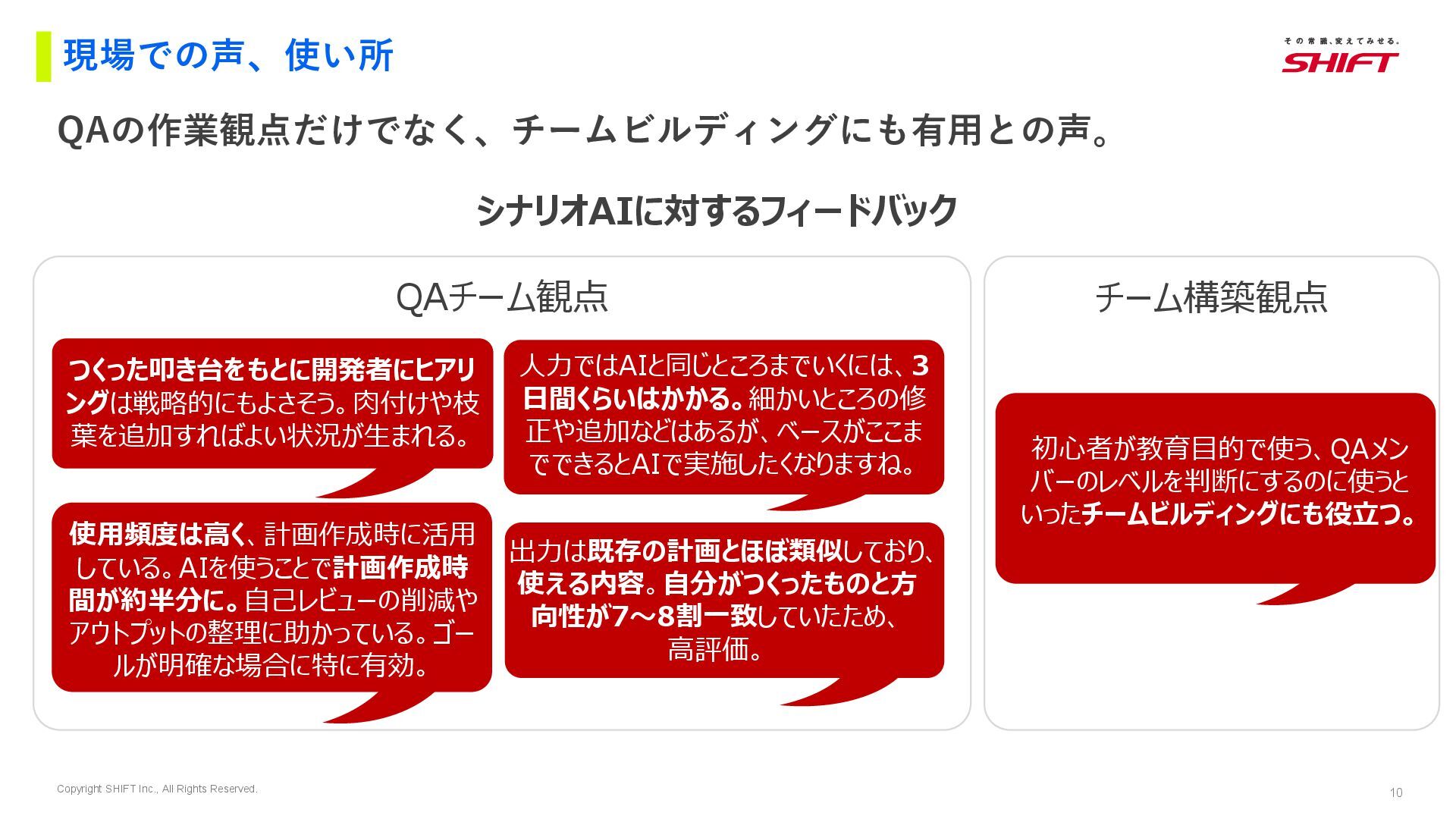 ングは戦略的にもよさそう。肉付けや枝 葉を追加すればよい状況が生まれる。 人力ではAIと同じところまでいくには、3 日間くらいはかかる。細かいところの修 正や追加などはあるが、ベースがここま でできるとAIで実施したくなりますね。 出力は既存の計画とほぼ類似しており、 使える内容。自分がつくったものと方 向性が7~8割一致していたため、 高評価。 使用頻度は高く、計画作成時に活用 している。AIを使うことで計画作成時 間が約半分に。自己レビューの削減や アウトプットの整理に助かっている。ゴー ルが明確な場合に特に有効。 QAチーム観点 チーム構築観点 初心者が教育目的で使う、QAメン バーのレベルを判断にするのに使うと いったチームビルディングにも役立つ。 シナリオAIに対するフィードバック