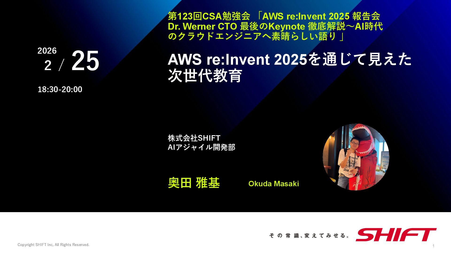 Inc, All Rights Reserved. 1 第123回CSA勉強会 「AWS re:Invent 2025 報告会 Dr. Werner CTO 最後のKeynote 徹底解説~AI時代 のクラウドエンジニアへ素晴らしい語り 」 株式会社SHIFT AIアジャイル開発部 Okuda Masaki 25 2 18:30-20:00 奥田 雅基 AWS re:Invent 2025を通じて見えた 次世代教育